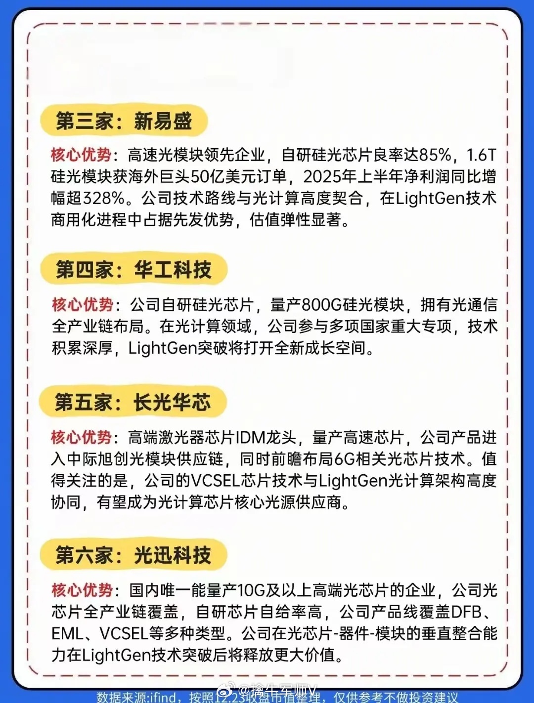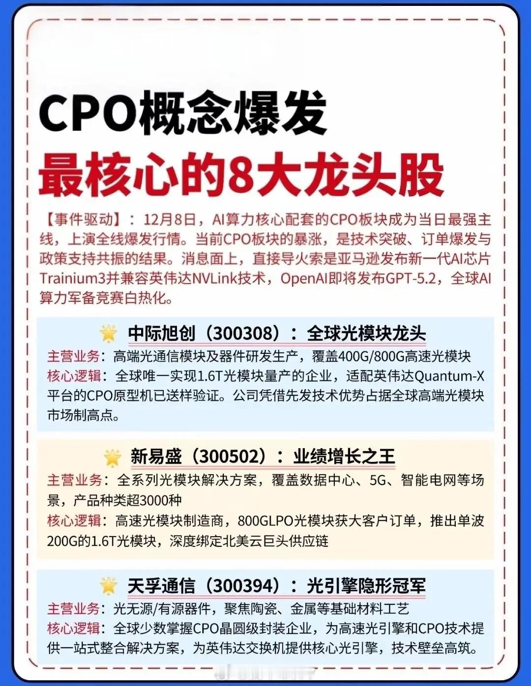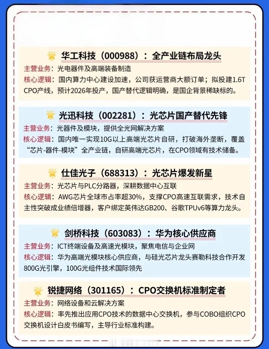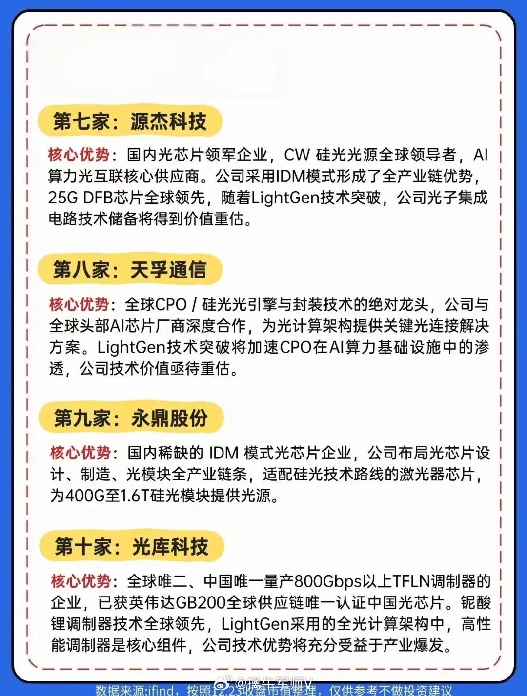 光芯片领域迎来里程碑式突破!上海交大研发的全光大模型语义生成芯片LightGen,实现了光计算技术在AI大模型应用中的关键飞跃,也让光芯片商业化预期从中远期概念转向中短期落地。相关概念十大龙头企业有哪些?AI算力需求引爆CPO与光芯片赛道,技术突破、订单爆发叠加政策支持,让相关板块迎来发展新机遇。从中际旭创、新易盛等CPO八大龙头,到中际旭创、仕佳光子等光芯片十大核心企业,每家公司都凭借独特的技术优势和业务布局,在产业链中占据关键位置。理财有风险入市需谨慎!资料取材网络仅供参考不能作为投资依据。