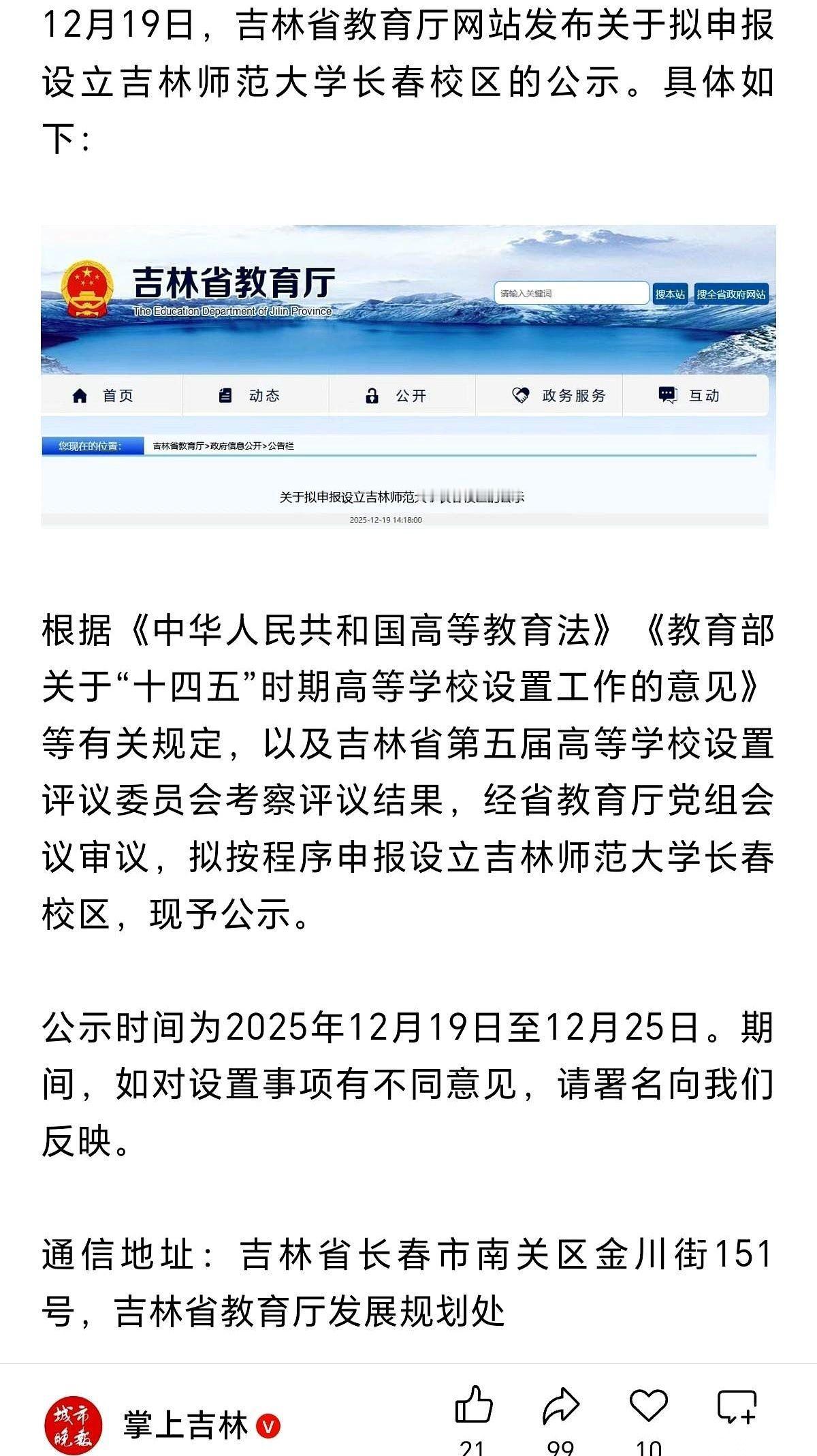 吉林师范大学,终于要来长春了! 讲真,这事儿比盖几栋楼的意义大多了。 这么多年,校名里顶着个“吉林”,主校区却一直在四平。总觉得……有点憋屈,差了那么点意思。 别误会,我不是说四平不好。 吉师大在我们心里,就是那所很牛的老牌师范,实力一直在线,多少好老师都是从那儿出来的。 但时代变了。 一个省属的重点大学,待在省会,和待在其他城市,那能一样吗? 你品品。 眼界、资源、跟那些顶尖大学交流的机会、学生未来的就业…… 说白了,就是把一个本来就很能打的选手,直接放到了C位的聚光灯下面。 这盘棋,下得漂亮。 格局,一下就打开了。 这对吉师大自己,对那些想考师范的孩子,甚至对整个吉林的教育版图,都是一步好棋。看着家乡这些年憋着一股劲儿往前冲,这种感觉,真带劲。