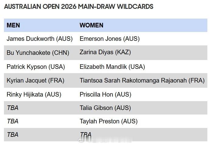 澳大利亚网球公开赛官方公布一批男女单打正赛外卡归属,4位本土好手韩天遇、土方凛辉、吉布森以及普雷斯顿在列。韩天遇在本赛季进步显著,在美网从资格赛打起连胜5场,职业生涯首次跻身大满贯32强;随后又在中网取得4连胜,闯入32强;她的世界排名在10月首次挺进TOP100,但后续受困于伤病未能继续突破。目前,韩天遇世界排名No.119,因此需要依靠外卡才能入围在本土进行的大满贯赛事。“我由衷感谢澳大利亚网球协会给予我的外卡。为了争取不用依靠外卡参赛,我拼尽全力挑战身体极限,不过还是非常感谢澳网协一直以来的支持。能够代表澳大利亚征战赛场,我深感自豪,也已经迫不及待想看看自己能走多远了!”土方凛辉是2023年澳网男双冠军得主,2025年他在温网重返大满贯男双决赛。单打方面,土方凛辉现世界排名No.114,曾在2023年闯入美网第四轮,此番将是他连续第四年出战澳网男单正赛。“非常感谢能再获一次征战澳网正赛的机会。没有什么比在本土大满贯赛场征战更棒的事了,墨尔本留存着我许多最美好的回忆。我已经迫不及待想要感受一月赛场那热烈沸腾的氛围了。”土方凛辉说道。其余两个外卡名额归属吉布森和普雷斯顿,加上与美网和法网的交换外卡、亚太区外卡赛冠军外卡以及澳洲积分赛冠军外卡,目前2026澳网单打正赛外卡仅剩4席(男3、女1)仍待官宣。澳网2026