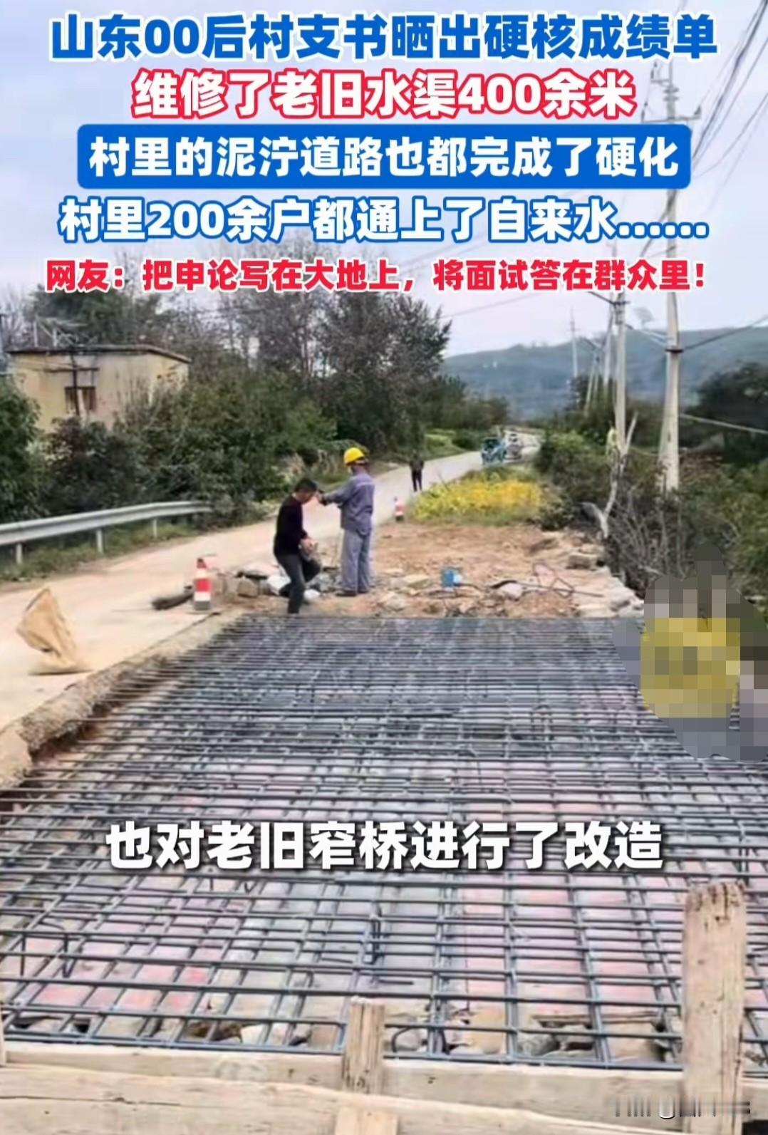 网友赞美声一片!山东00后村支书晒出的硬核成绩单! 这一年,维修了村里的老旧水渠400多米,对村里的泥泞道路也都完成了硬化。 同时也对老旧窄桥进行了改造。新修建拦河坝4座,村里200多户都通上了自来水。 在寒暑假期间,我们办了免费的暑期托管班,并且中午在村委会免费管一顿午饭。在今年的4月份我们开启了我们的抖音直播,让村里的一些老百姓跟着我们干些活,能够赚一点钱。村里还举办了很多娱乐活动。 也对村里所有的孤寡老人进行了走访和慰问帮扶等! 网友留言,为年轻的书记点赞,看似平常的事,却凝聚着您的心血。百姓身边就需要这样的带头人。党需要您这样的基层书记! 这才是真正的年度工作总结,都是踏踏实实,实实在在的做事! 干的漂亮,我们大量需要这样的干部! 这成绩单:老百姓看的见,摸的着,看的懂,听的明! 这才是受老百姓欢迎的基层官员,贴近群众、解决实际问题,为这样的村干部点赞! 这才是当代年轻人应有的责任感使命感,有担当不怕苦接地气。 将来的栋梁之材!小伙子加油!