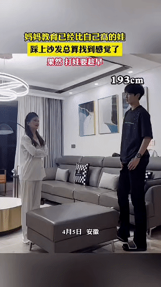 4月5日安徽,一位妈妈准备教育自家儿子,可儿子的身高早已超过了她,这让她在教育时少了些“气场”。为了找回教育的架势,妈妈直接踩上客厅的沙发和儿子对视,可即便站在沙发上,儿子只要站直身子,妈妈还是没他高,儿子也没忍住笑了出来,这有趣的一幕也让网友调侃“果然打娃要趁早”。高情商妈妈 生活日常