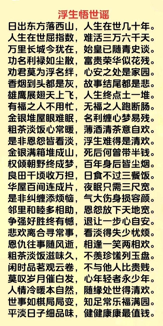 浮生不能太较真 半清半浊半天真 功名利禄如浮云 健康平安胜千金 金子银子不如身 车子房子不如亲 圈子瓶子皆是尘 不如全家欢笑声 人生百态皆是缘 尝遍酸甜苦辣咸 看淡得失少执念 自在逍遥赛神仙