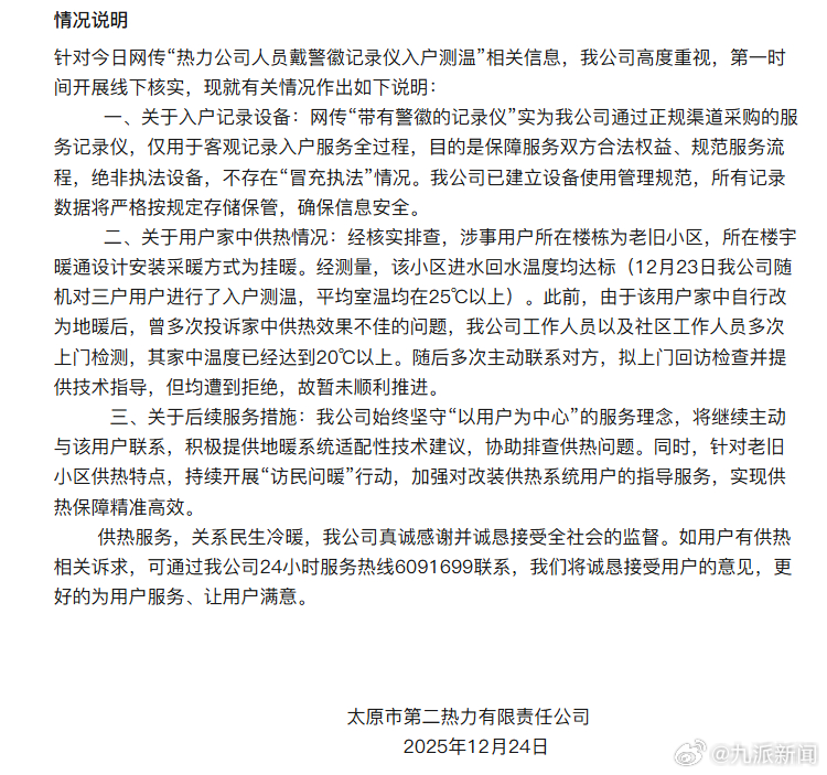 #热力公司人员戴警徽记录仪测温不实#【#公司否认员工戴警徽记录仪入户测温#:实为服务记录仪,不存在“冒充执法”情况】太原市第二热力有限责任公司12月24日发布情况说明:针对今日网传“热力公司人员戴警徽记录仪入户测温”相关信息,我公司高度重视,第一时间开展线下核实,现就有关情况作出如下说明: 一、关于入户记录设备:网传“带有警徽的记录仪”实为我公司通过正规渠道采购的服务记录仪,仅用于客观记录入户服务全过程,目的是保障服务双方合法权益、规范服务流程,绝非执法设备,不存在“冒充执法”情况。我公司已建立设备使用管理规范,所有记录数据将严格按规定存储保管,确保信息安全。 二、关于用户家中供热情况:经核实排查,涉事用户所在楼栋为老旧小区,所在楼宇暖通设计安装采暖方式为挂暖。经测量,该小区进水回水温度均达标(12月23日我公司随机对三户用户进行了入户测温,平均室温均在25℃以上)。此前,由于该用户家中自行改为地暖后,曾多次投诉家中供热效果不佳的问题,我公司工作人员以及社区工作人员多次上门检测,其家中温度已经达到20℃以上。随后多次主动联系对方,拟上门回访检查并提供技术指导,但均遭到拒绝,故暂未顺利推进。 三、关于后续服务措施:我公司始终坚守“以用户为中心”的服务理念,将继续主动与该用户联系,积极提供地暖系统适配性技术建议,协助排查供热问题。同时,针对老旧小区供热特点,持续开展“访民问暖”行动,加强对改装供热系统用户的指导服务,实现供热保障精准高效。