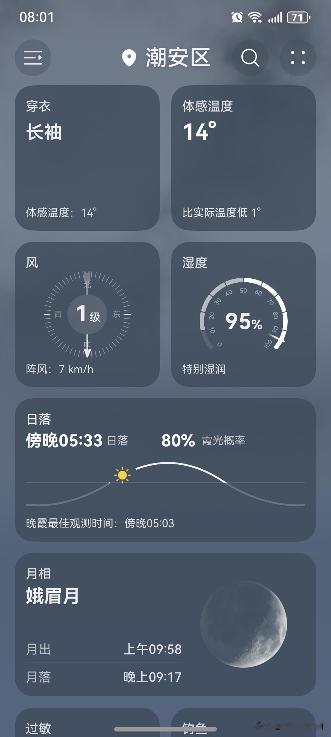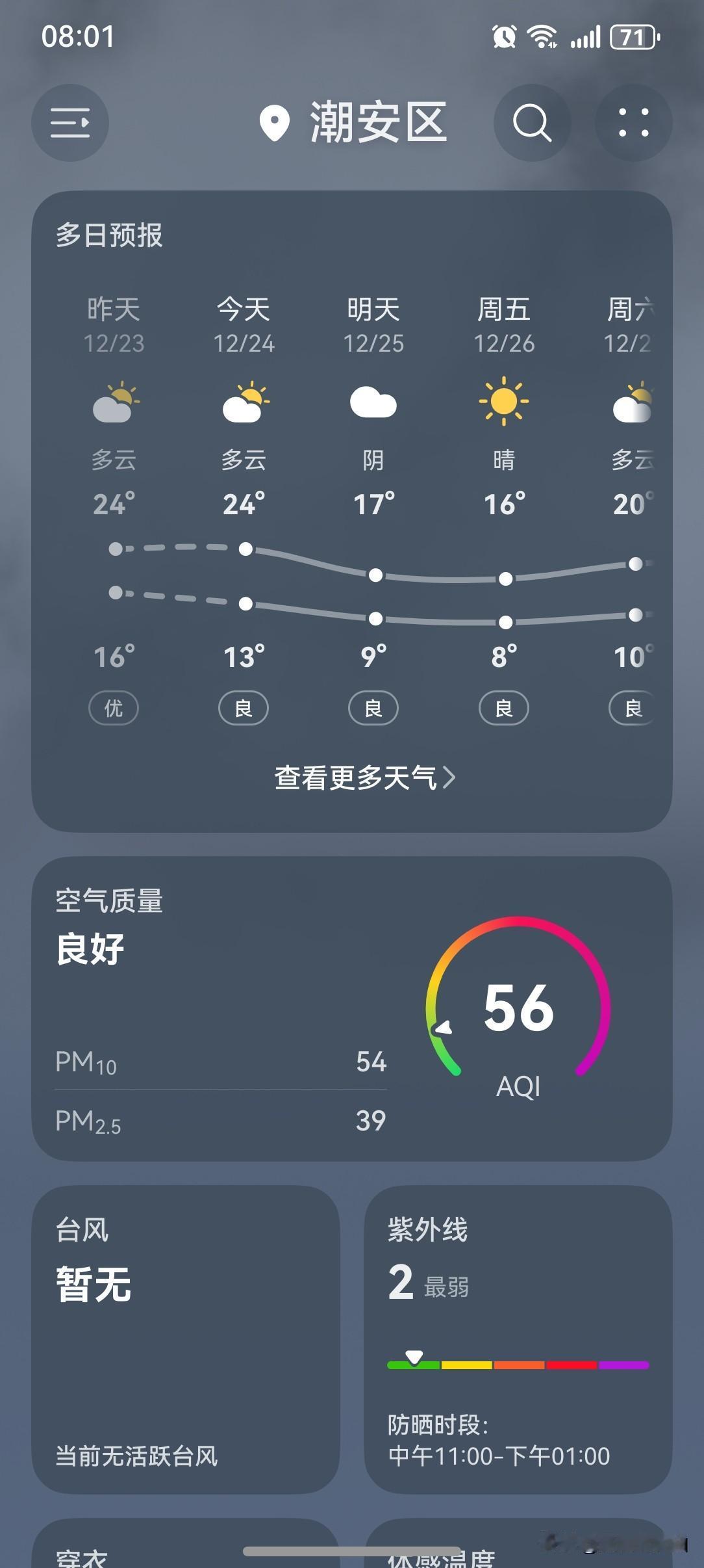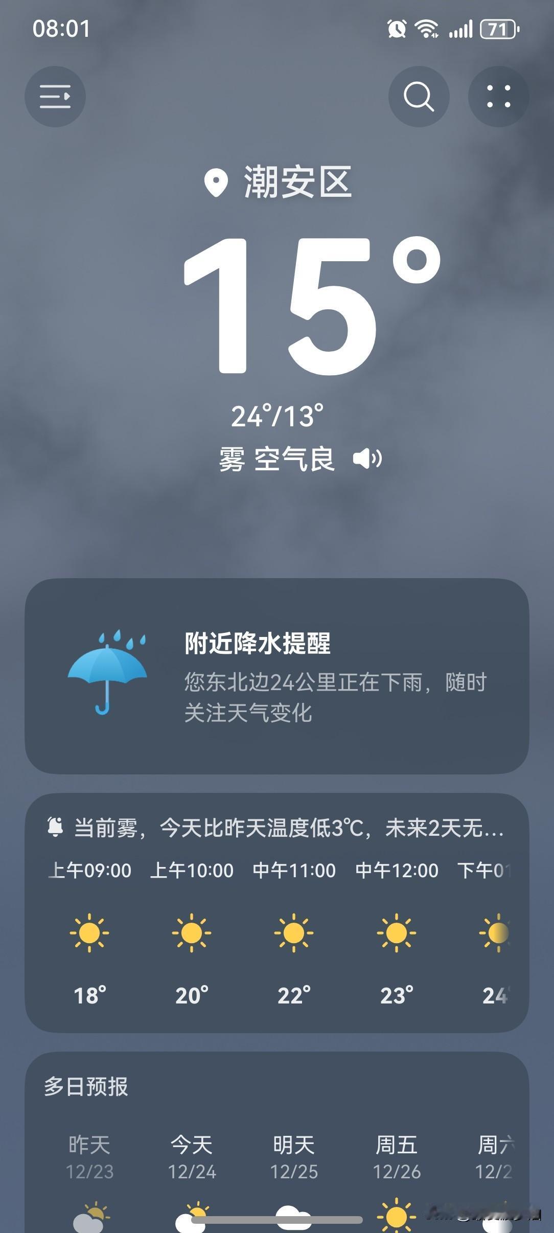 今天(24日)白天到夜间中等冷空气自北向南影响广东。 北方中等强度冷空气今天(24日)早晨开始影响粤西北部地区,24日傍晚到夜间影响中南部地区,并给我省带来弱降水,过程日气温下降4~7℃,过程最低气温将出现在26日早晨前后,粤北部分市县将出现≤5℃的低温,高海拔山区局部有冰冻。 今天(24日),潮州喜提一个多云天气,气温13~24℃,此刻气温15℃,体感温度14℃。 一起来看看今天的天空!一大早阳光上线营业,不过雾倒是有点大。这一眼望去,太阳像是被描绘上一层金色的边缘,多了几分“日出金山熠熠生辉”的美感,妙哉!妙哉! 早晨六点的气温还是比较低的,这会太阳已经升起,寒意将逐渐褪去。 早上出门的小伙伴们,外套还是要带上。毕竟冷空气今天要来,特别是粤北地区的小伙伴,每逢冷空气来袭,总会第一时间感受到寒冷,这次也不例外。 其它地区相对来讲就没那么快感受到寒意了,毕竟需要给冷空气一点时间,温是都要降的,主打一个雨露均沾嘛!但也分前后。 我们这边今天气温还是暖暖的,喜提全天最高气温24℃,跟昨天差不多。 多暖和一天算一天,又是接着奏乐接着舞! 今天的天气,依然能够凭实力获得一个五星好评啊! 如此天气!元芳,你怎么看? [笑哭][捂脸][我想静静][笑哭][捂脸][笑哭][我想静静][笑哭]