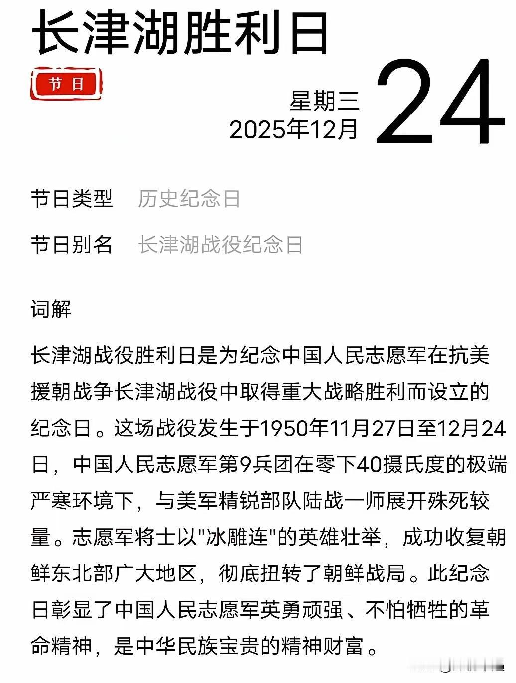 12月14日的钟声响起,可千万别忘了七十多年前长津湖畔的冰天雪地和烽火硝烟。就是这天,咱们的志愿军将士凭着钢铁意志,硬是把武装到牙齿的强敌打退。 紧接着的12月24日夜,胜利的号角响彻战场,那不仅是志愿军的庆功夜,更是咱祖国的平安夜。 咱现在能夜夜安睡,家家户户灯火通明,全是先烈们用命拼出来的。没有他们在冰天雪地里啃冻土豆、浴血冲锋,哪来的山河无恙、国泰民安?和平日子里,这段历史必须刻在骨子里,永远致敬那些再也没回家的英雄。 各位读者你们怎么看?欢迎在评论区讨论。