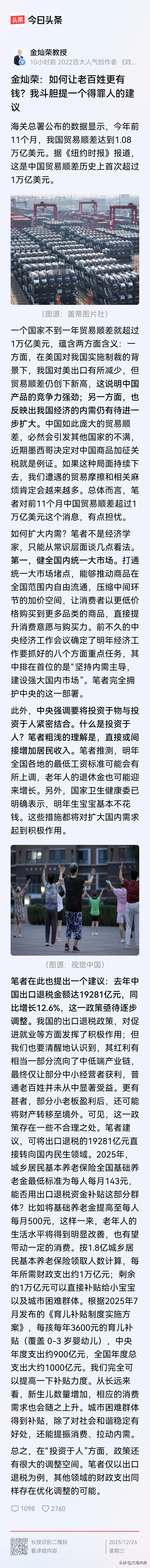 我大力支持金灿荣这个建议! 金灿荣说 去年 我国出口退税总额 达19281亿元 但普通老百姓 并未从中受益 金灿荣说 如果 将这19281亿元 用于改善民生 那是一件极好的事 金灿荣建议 将出口退税 用于3个方面 1是提高养老金水平 2是用于补贴小宝宝 3是用于城市困难群体 文海冲浪点评 金灿荣建议将出口退税用于老年、小孩、困难群体,这个建议值得有关部门认真研究!这是一个很不错的建议!