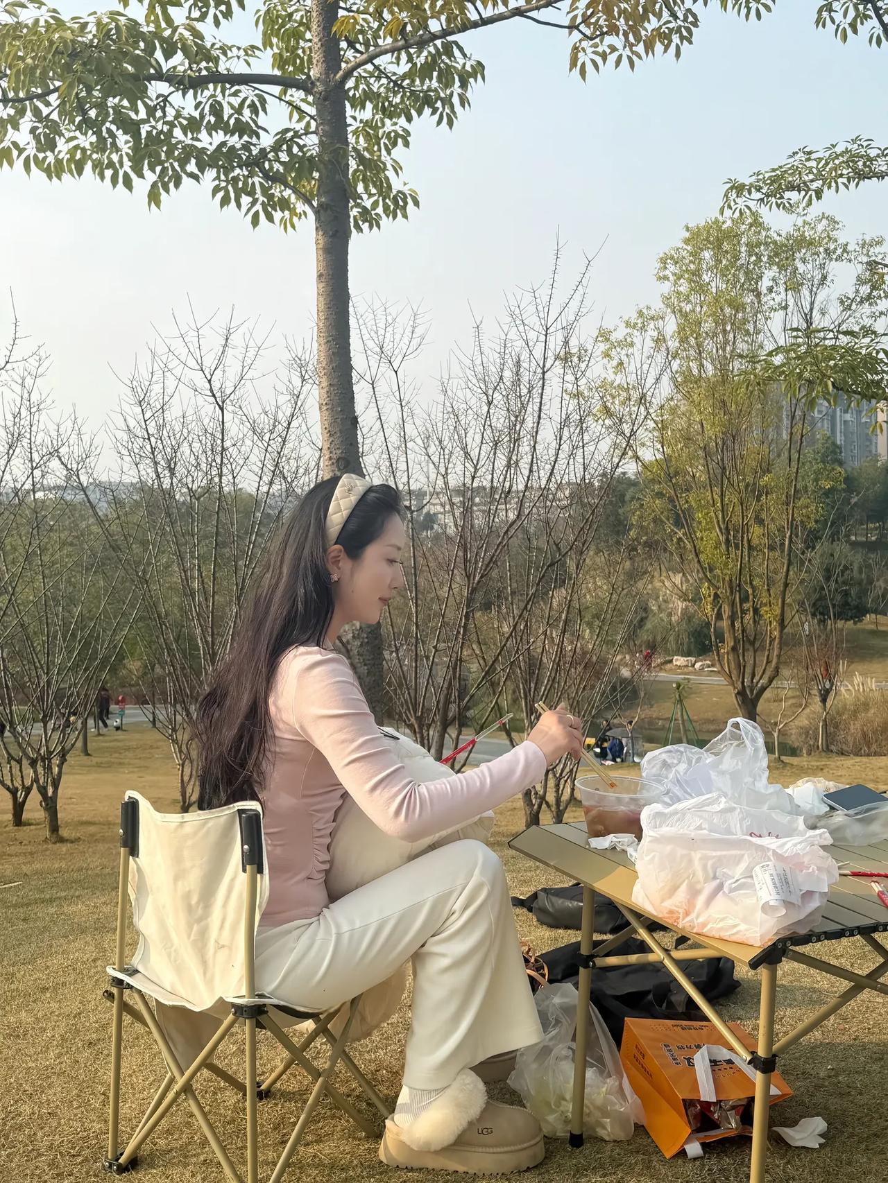 粉衣少女立绿荫,笑语盈盈意自闲。