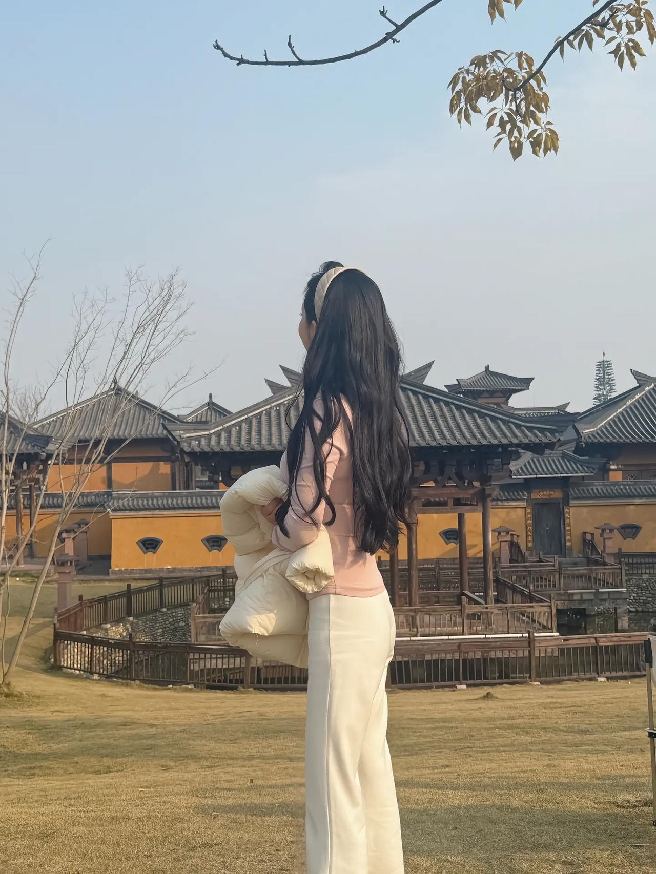 红衣少女背对镜头,眺望山峦起伏,心旷神怡。