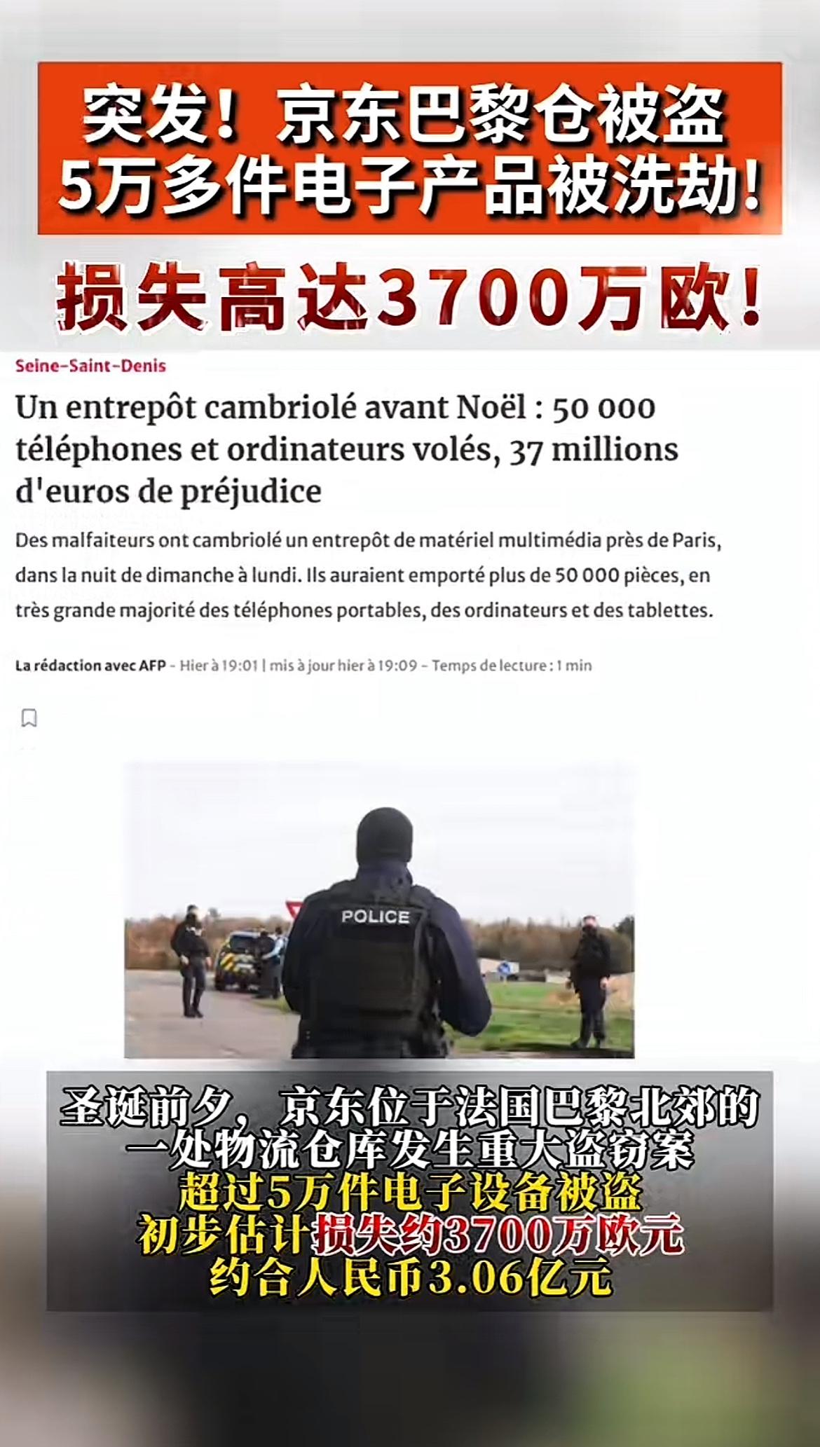 不偷不是意大利,不抢不抢法兰西,以前只当是玩笑,直到京东在法国的仓库被洗劫,才懂这话有多讽刺。 京东这次损失大了,3700万欧元,折合人民币近3亿元。这不是简单的盗窃了吧,这么高的金额就是明抢啊!要知道,京东的海外仓库绝非小门小户,安保系统必然是层层设防,监控、巡逻、门禁一个都不会少,普通盗贼别说得手,连靠近都难。能悄无声息卷走数亿财物,这背后的操作绝不可能是散兵游勇能办到的,甚至让人怀疑是不是有内外勾结的猫腻。 这场失窃案,彻底撕下了法国营商环境的遮羞布。连跨国巨头的资产都保不住,那些想出海投资的中小企业,谁敢往里跳?法国这次算是把自己的名声彻底搞臭了,所谓的浪漫之都,在资本眼里早已变成了风险之地。 京东远渡重洋开拓市场,平白遭此横祸,要是法国政府不给个合理说法,不拿出实际的补偿方案,寒的可不止是东哥的心,更是所有海外投资者的信任。
