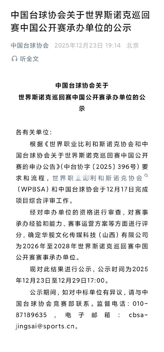 斯诺克:山西首次举办职业斯诺克比赛! 日前,中国台球协会官宣,华舰文化传媒科技(山西)有限公司为2026年至2028年世界斯诺克巡回赛中国公开赛赛事承办单位。这也意味着未来至少三年的中国公开赛将在山西举办。这也是山西首次举办职业斯诺克比赛!