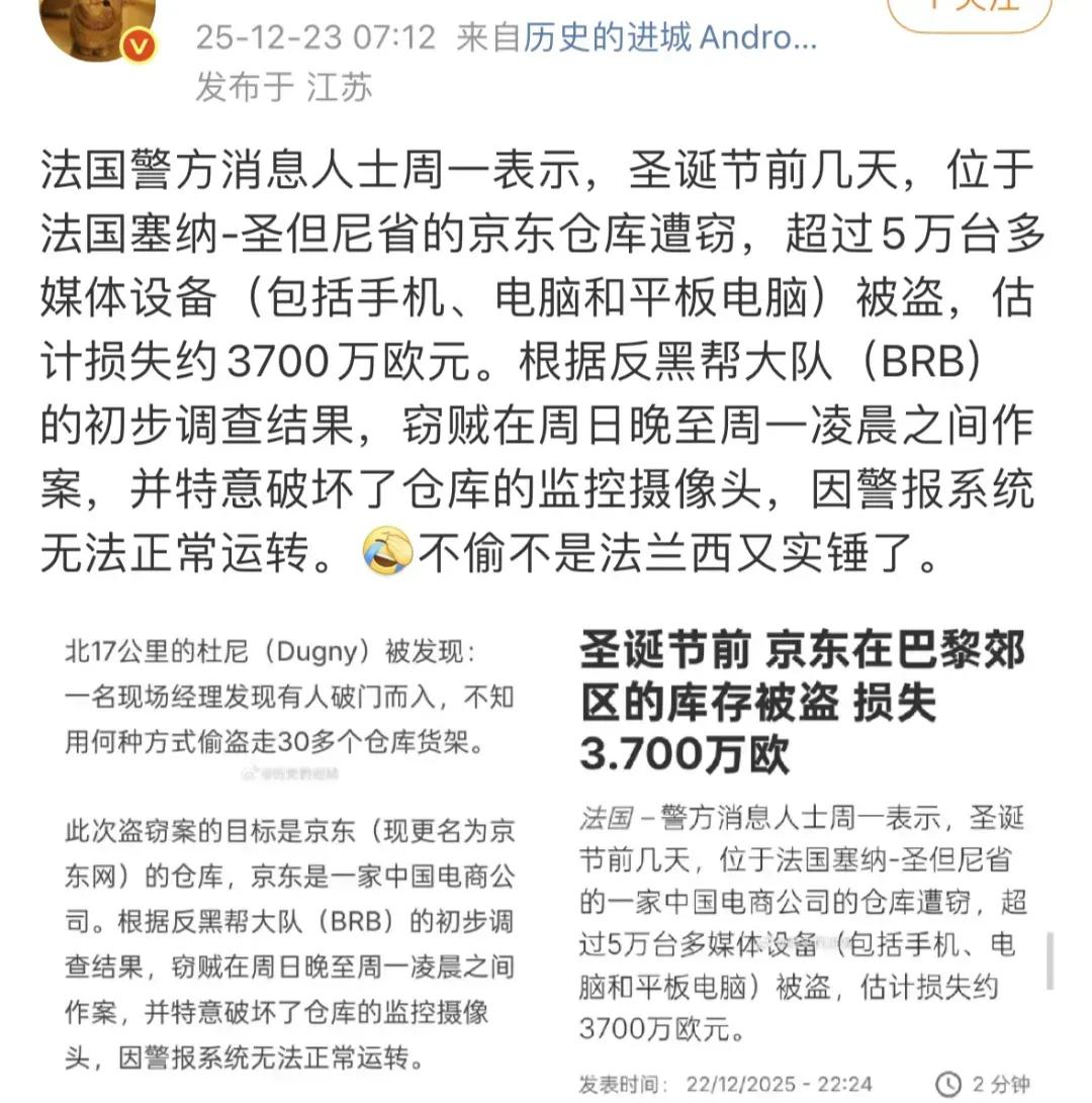 京东法国仓库遭遇海外大盗,损失相当惨重,这给其他国产企业敲响警钟。12月22日,京东位于法国巴黎的京东仓储遭遇盗抢事件,据外媒称仓库内30个货物托盘被洗劫一空,超过5万台数码设备被盗,价值约3700万欧洲(合3.06亿人民币),损失巨大。 不过随后京东承认遭遇盗抢,却否认损失金额,回应称“损失与实际情况有较大出入”,至于是报少还是报多京东没有说。不过法国初步调查结果表明,京东仓库摄像头被破坏,警报系统全部失效,表明窃贼为高度专业化团伙,熟悉仓库布局和安保系统,撬开仓库大门实施盗窃,短时间内迅速完成作案逃离现场,没有留下太多证据。 就目前公开的信息,不排除京东法国仓库有内鬼策应,否则很难理解当今时代,京东的技术手段居然挡不住一伙盗贼。这起案件也给大家刷新了认知,别把欧洲国度看的有多文明,很多情况还不如国内安全,欧洲人骨子里的盗贼传统并没有消失。别以为“0元购”只会发生在印度这样混乱的地方,只要利益诱惑够大,哪里都有硕鼠。与其相信个人,不如提高AI技术的防控等级,技术可以没有人性,也更不易犯错误。