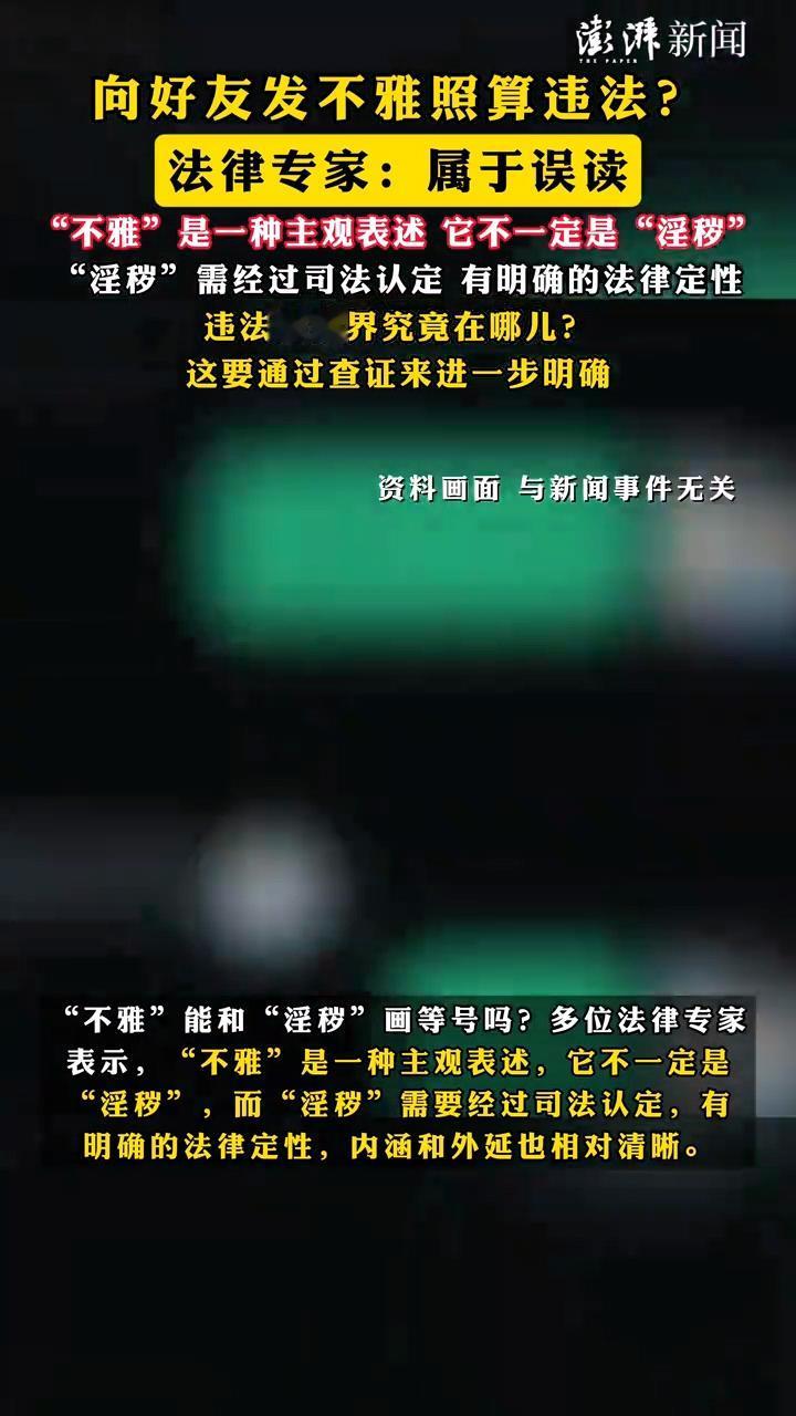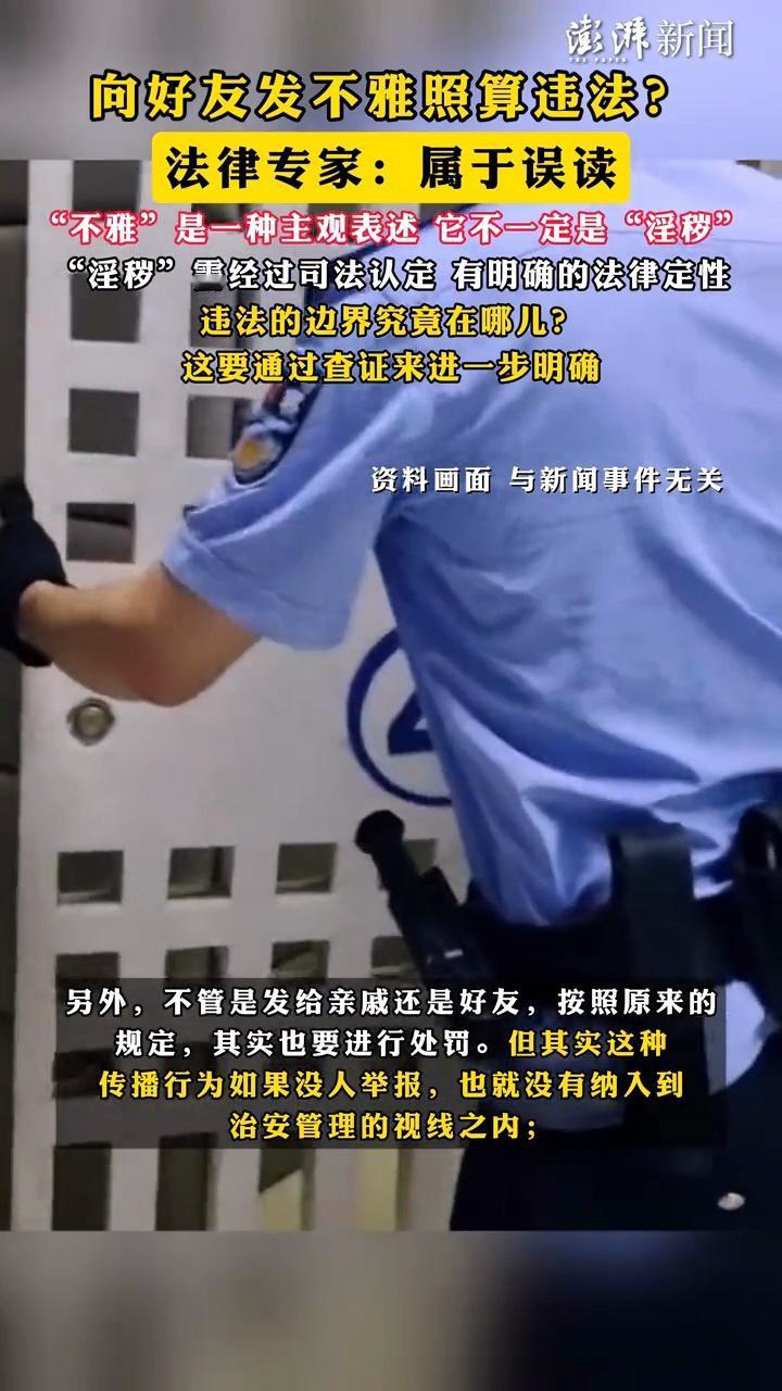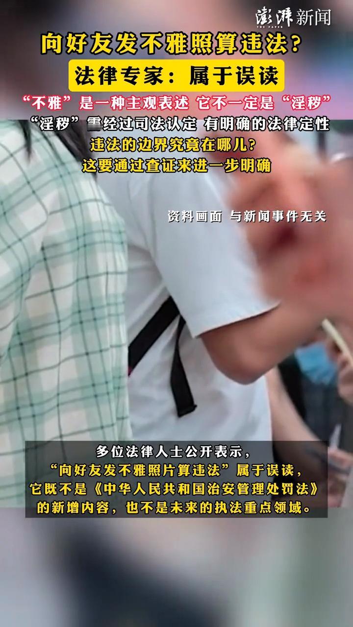 给好朋友发送不雅照算不算违法? 最近,这个问题在网上爆火,主要是因为新的治安管理处罚法马上就要在1月1日实施了。 有很多网友都对这个问题相当感兴趣,现在有专业人士对这个问题进行解读了。 首先,可以明确的是,治安管理处罚法中并没有新增“给好友发送不雅照违法”这一点,只不过是部分网友的误解。 而且,就算给好朋友发送不雅照,也不一定就构成了违法行为。现实中对于违法行为的界定,需要发送的不雅照达到淫秽的标准,才算违法,而这需要经过司法认定。如果只是不雅照片并没有达到淫秽标准,也构不成违法行为。 再退一步说,即便真的给好友发送了大尺度的不雅照片,也需要有人举报,如果没有举报,这种行为也不会纳入治安管理处罚的视线之内。 话虽然这样说,不过大家还是要遵纪守法,千万不能在法律边缘试探。