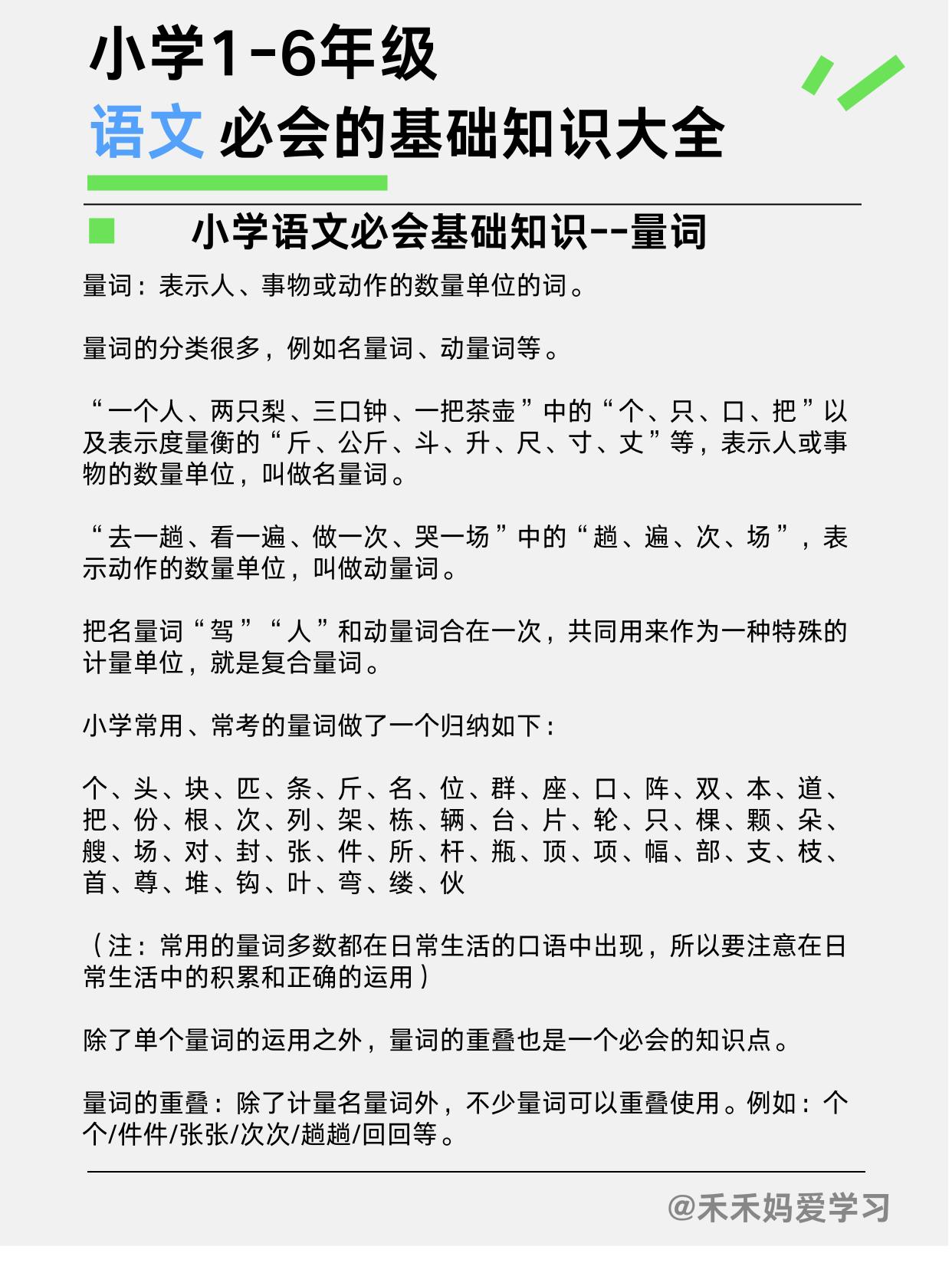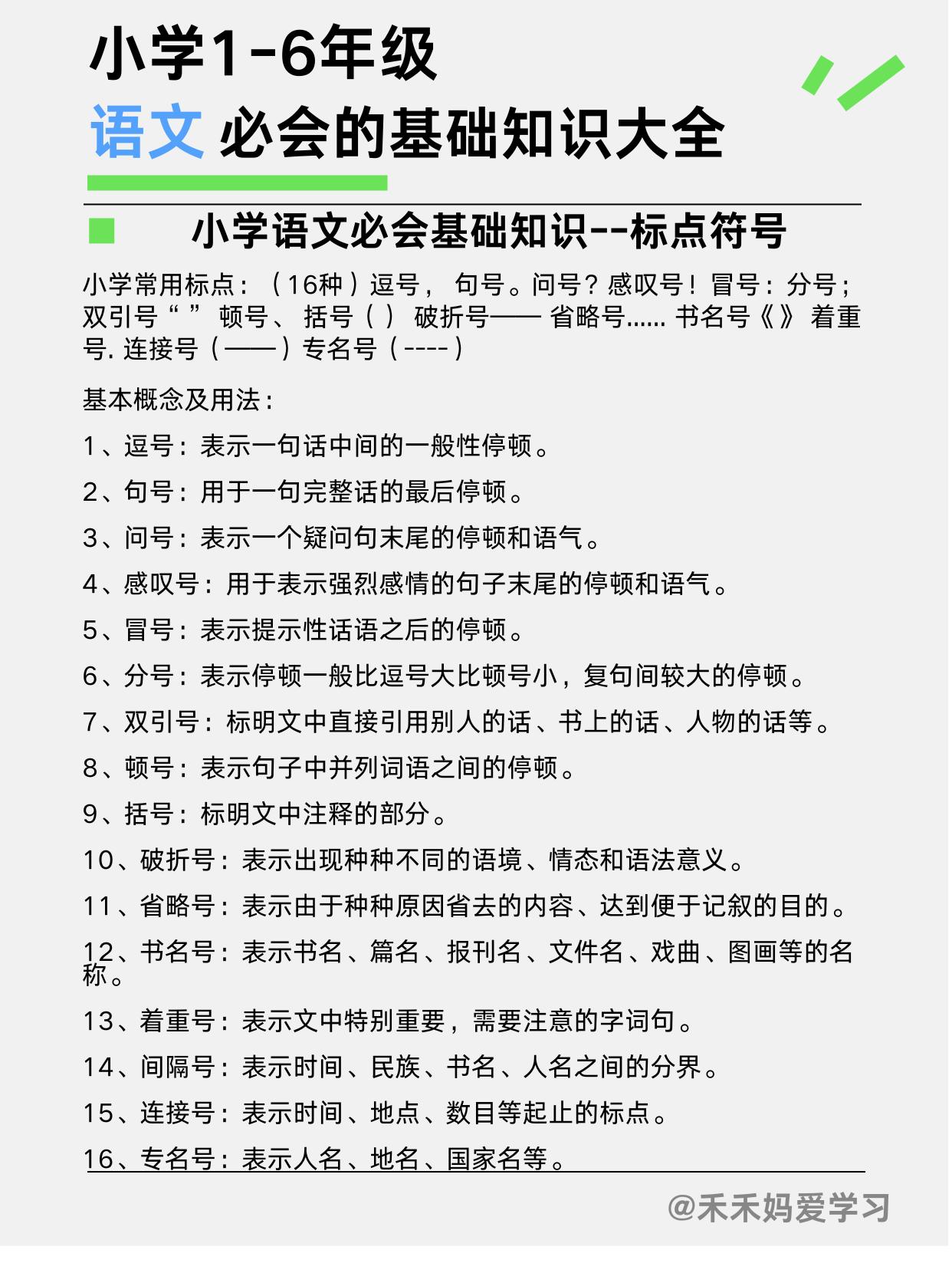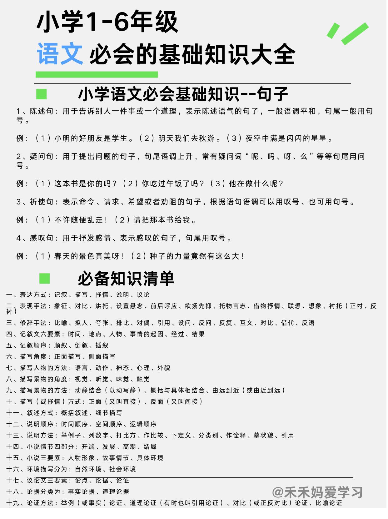 语文是一门大科,占分比重很大,但很多家长,尤其是小学家长,都不重视孩子的语文学习,认为它只是简单的识字、背诵和朗读。 却不知,小学语文6年需要掌握的绝非识字和背诵那么简单,背后所学知识点远超我们的想象。 父母若不加以重视,孩子语文基础打不好,到了高年级再提升就非常难了,分享一份1-6年级小学语文教材的核心知识点,希望各位家有小学生的父母可以收藏起来,最好打印出来贴在孩子书桌旁,对孩子打语文基础可起到非常重要的作用。