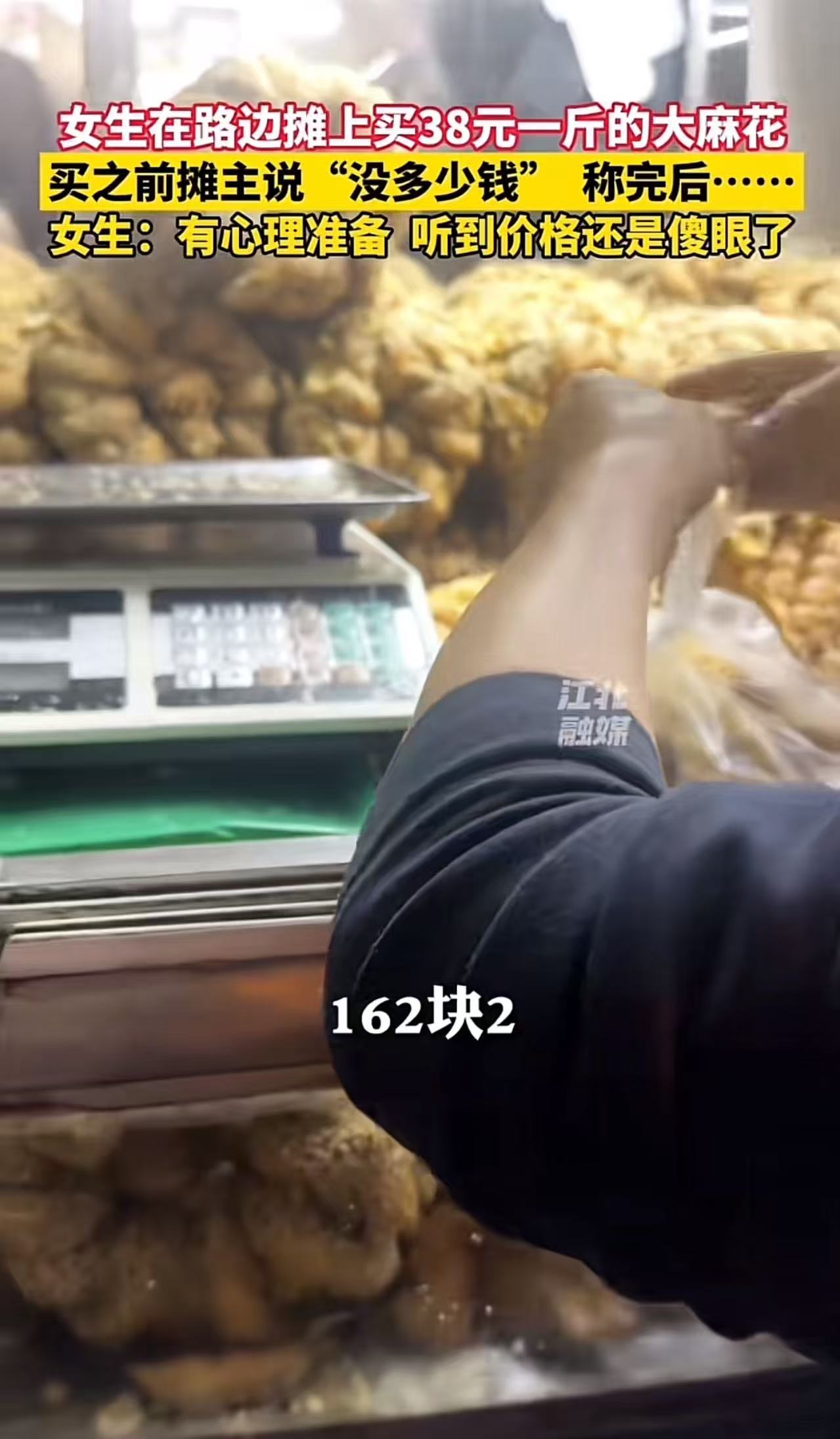 接着,女生指了一个自己想要的位置,摊主手起刀落,麻利地把大麻花切了下来,然后往秤上一放,大声说道:“162块2!”