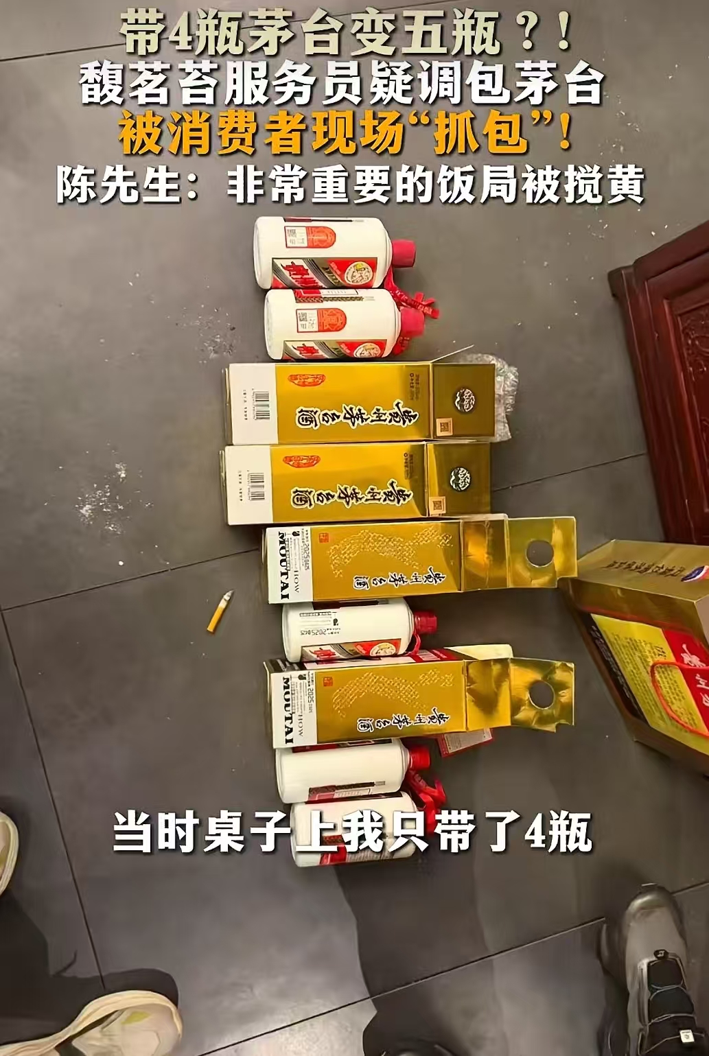 湖南长沙,男子带4四瓶茅台宴请客人,结果发现服务偷偷掉包他的茅台。他质问服务员为什么要这样干?结果服务员转身跑了!男子找到餐馆赔偿,餐馆老板表示服务员是新人,他们也是受害者!