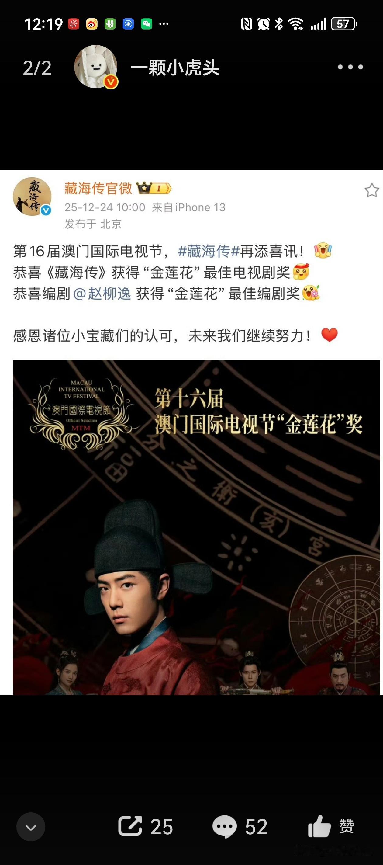 肖战《藏海传》荣获澳门国际电视节金莲花奖,或最佳电视剧和最佳编剧,恭喜藏海传,所有的奖项只是开始,藏海值得所有的大奖