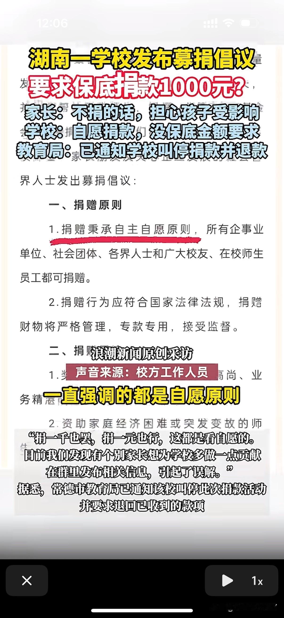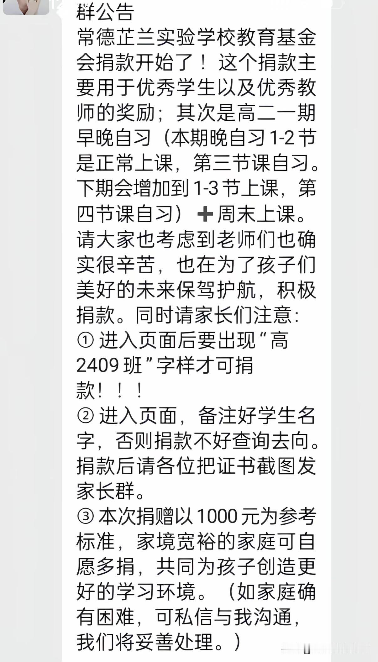 家长群里要求每个学生家长捐款以1000元为标准这事学校觉得很冤枉,因为要钱的信息不是老师发的也不是学校发的而是家委会的人发的 而且学校也说了是完全自愿的捐款从来就没有强迫要每一位学生家长都捐款,虽然说一千元是最低标准但是没有设最高标准啊,没有定一个数必须要捐一千,公告也说了学生家里要实在困难拿不出钱来捐款的可以私下沟通解决,捐了钱的把捐款截图发群里让大家都看到这个就不要私下沟通了 虽然学校在官方公众号里也发了捐款倡议但是没有要求要以1000元为标准这都是家委会的家长自作主张 事情被发布到网络引起舆论后目前常德市教育局已经叫停了此次捐款活动,也在核查这1000块捐款标准源头是从谁嘴里说出来的,已经交了1000元捐款的学生家长会把钱退还回去
