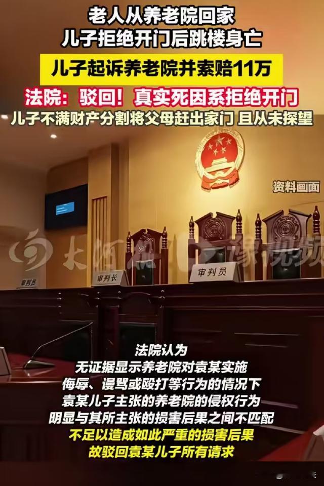 四川成都,养老院组织老人们看电视,袁大爷想换台遭到拒绝,几天后袁大爷离开养老院,来到儿子家,可儿子拒绝开门不让他进屋,袁大爷跳楼后离世。案发后,袁大爷的儿子和老伴称,工作人员拒绝换台致使袁大爷受辱,才导致他想不开,要求养老院赔偿111839元。 据大河报报道,袁大爷是大邑县人,2023年12月,袁大爷和老伴入住了一家养老院,当时袁大爷的老伴代替他签了入住协议,声明袁大爷没有自残倾向。 2024年8月8日傍晚,养老院打开大厅的电视机,组织老人们吃晚饭。 据袁大爷的老伴称,当天袁大爷想看奥运频道的乒乓球比赛,于是要求工作人员换台,但是遭到了拒绝。 11日一大早,袁大爷没给任何人打招呼,一个人离开养老院来到儿子家。 袁大爷敲响儿子的门,称感觉到自己时日无多,想要在自己家里走完人生最后一程,但是儿子一直不开门。 袁大爷一时情绪激动报了警,哭诉和儿子发生了争执,儿子将他关在门外不让他进去。 民警劝解了袁大爷一番后,待他情绪平静下来后离开。 谁知过了半个小时,民警再次接到报警,袁大爷竟然跳了楼。 案发后,袁大爷的老伴还给养老院打过去电话,说这事不怪他们。 可转眼间,老伴就和儿子统一了口径,称袁大爷是因为在养老院想换台遭到拒绝,自尊心受挫想不开才想不开的。 养老院傻眼了,袁大爷的儿子称,老父亲一把年纪了未能得到善终,养老院得赔钱。 双方争执不下,袁大爷的儿子和老母亲竟然将养老院起诉了,要求他们赔偿各项损失11万余元。 庭审时,养老院大声喊冤,称事情根本不是这样的,养老院辩解: 1、袁大爷的老伴称,案发当天袁大爷要求换台,可据大厅的监控显示,当天袁大爷全程背对着电视在吃饭,根本没看电视,实际上,要求换台的是袁大爷的老伴。 2、袁大爷没有要求换台,老伴声称的袁大爷受辱也不存在,他跳楼的原因根本和养老院无关,而是因为他的儿子。 养老院拿出证据,称袁大爷有儿子还住养老院,实际上是因为他被儿子赶出来了。 原来,几年前袁大爷和儿子因为家产分割问题产生了矛盾,最后,袁大爷将房子赠予给了二爷爷家的孩子,至此,他和儿子的父子关系彻底破裂,两人还签订了一份断绝关系声明。 随后,袁大爷被儿子赶了出去,袁大爷和老伴住养老院期间,儿子一次都没来看望过他们。 养老院认为,袁大爷跳楼,和他们没有任何关系,袁大爷的儿子要求赔偿,既无事实依据,也无法律依据。 那么,本案从法律角度应该如何看待? 首先,袁大爷因财产分配问题和儿子断绝关系,随后儿子将他赶了出去,王大爷住养老院期间,儿子也没看望过他。 实际上,袁大爷和儿子的断绝关系书是没有法律效力的,儿子的赡养义务也不因断绝关系书而免除。 《民法典》第一千零六十七条规定,成年子女不履行赡养义务的,缺乏劳动能力或者生活困难的父母,有要求成年子女给付赡养费的权利。 父母子女关系是基于血缘产生的,具有天然的、法定的属性,不能通过当事人之间的约定予以解除。 袁大爷虽然与儿子签订了断绝关系书,但这种行为并不能改变他们之间的血缘关系和法律上的权利义务关系。 儿子将袁大爷赶出家门,且在其入住养老院期间从未看望,这些行为明显违反了法律规定的赡养义务。 赡养不仅包括经济上的供养,还包括生活上的照料和精神上的慰藉。 儿子不仅没有履行这些赡养义务,反而在袁大爷最后的阶段、渴望回到家中得到儿子的关怀时,拒绝了袁大爷,这进一步反映出儿子在赡养方面的缺失。 2、养老院对袁大爷的是否应该承担责任? 《民法典》第一千一百六十五条规定,行为人因过错侵害他人民事权益造成损害的,应当承担侵权责任。 袁大爷老伴称袁大爷要求换台遭拒,但监控显示当天袁大爷全程背对着电视吃饭,实际要求换台的是其老伴。 退一步讲,即便养老院工作人员拒绝更换电视频道,言语较为生硬,这也只是在公共空间为了考虑大多数人的需求,并未超出一般人的容忍范围。 并且,从因果关系角度来看,袁大爷的儿子没有证据证明养老院存在侮辱殴打等行为。 袁大爷儿子声称养老院侵权,但养老院的行为与袁大爷的损害后果不匹配,不能认定袁大爷跳楼的行为与养老院工作人员拒绝更换电视频道存在因果关系。 袁大爷跳了楼,更可能是由于他与儿子之间长期存在的矛盾,以及儿子拒绝他回家等家庭因素导致的。 最终,一审驳回了袁大爷儿子和老伴的诉讼请求。 一审判决后,二人不服提起上诉,二审维持原判。