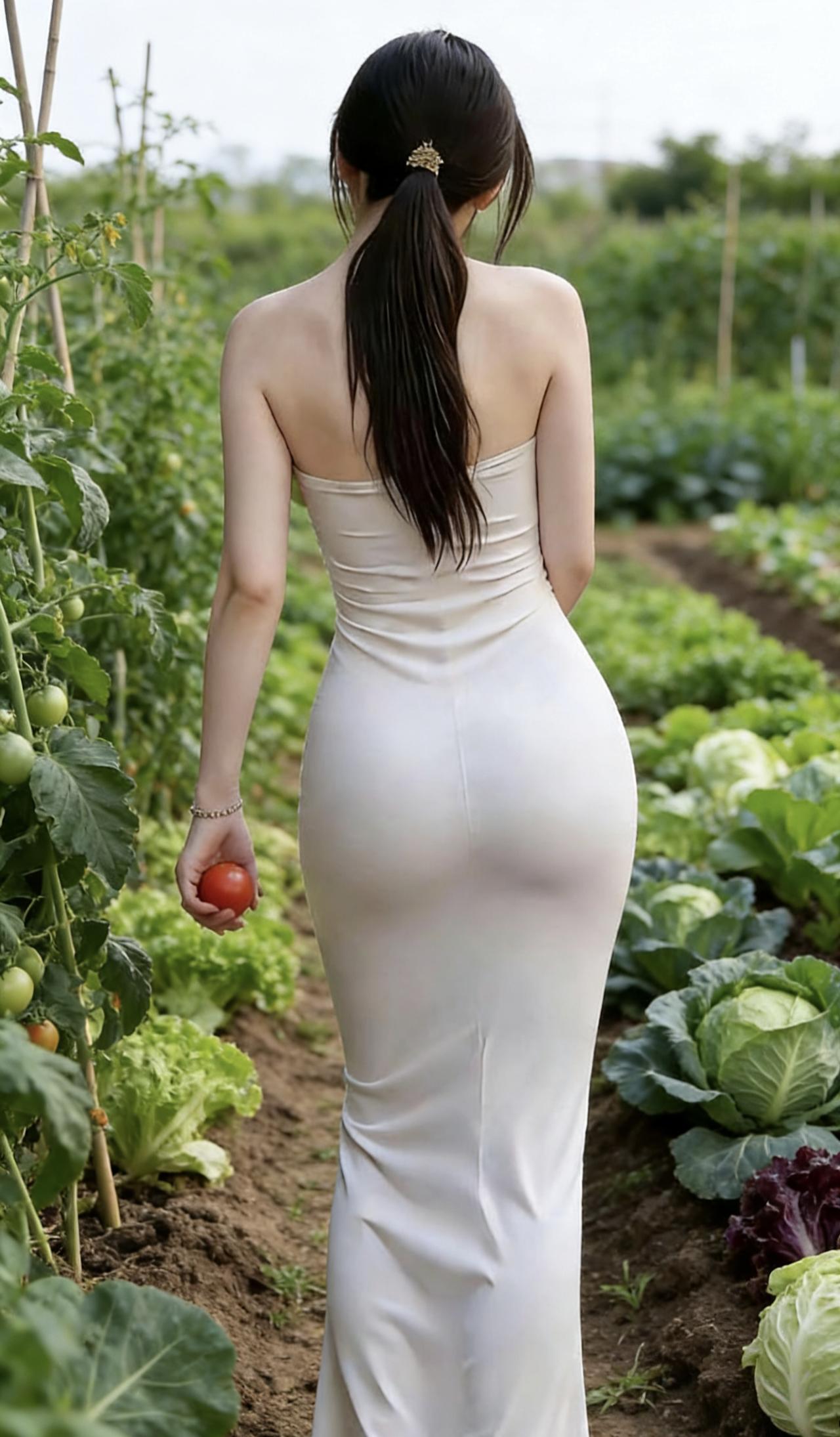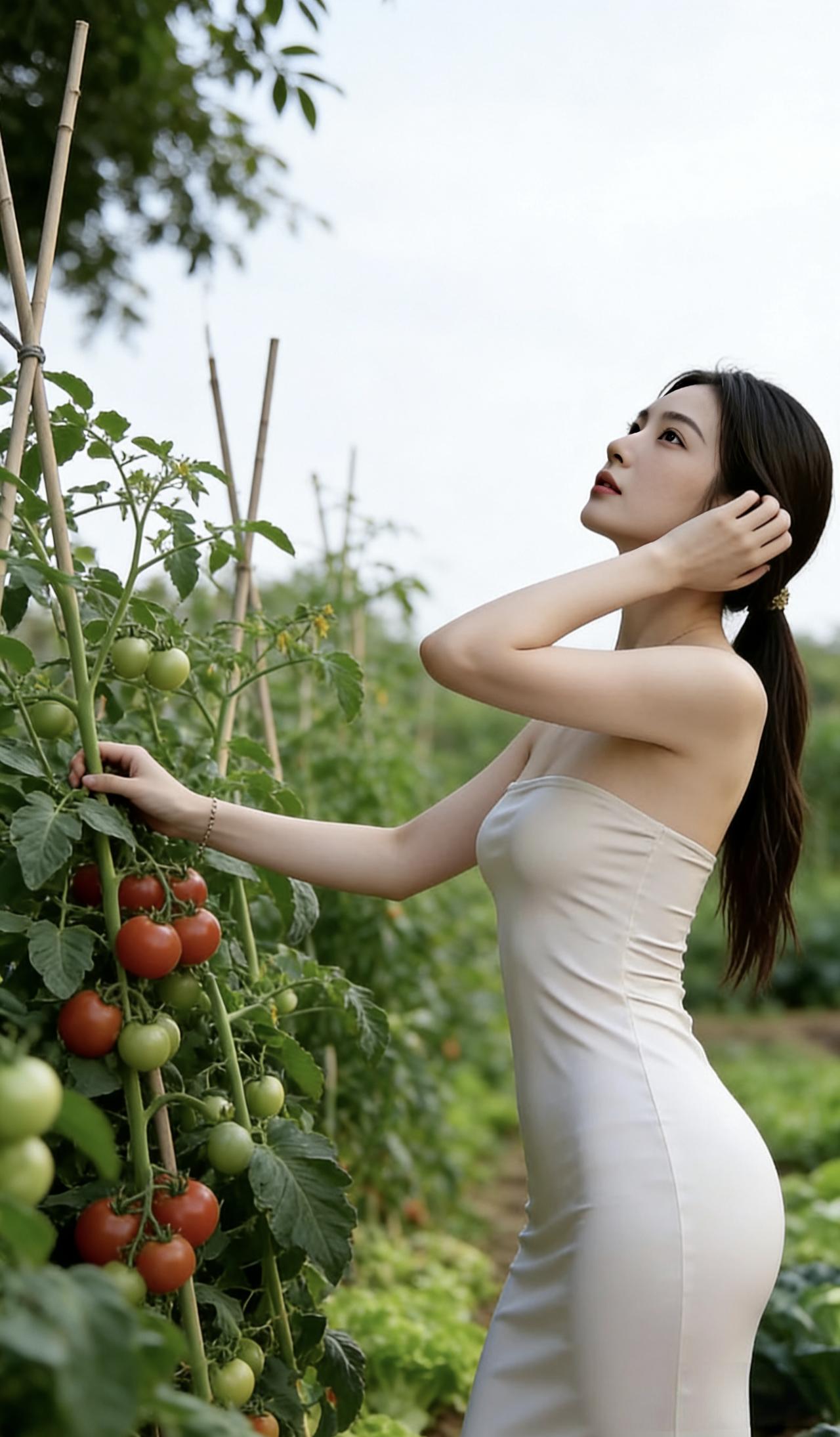 素裙袅袅立田畴,玉手轻拈番茄柔。 绿野分行生雅韵,青蔬满目映娇羞。 风梳秀发云垂鬓,日映罗衣雪满丘。 此景此情何所似,如诗如画醉双眸。田间笑语随风悠,素影徘徊意未休。 又采黄瓜盈翠篓,再寻豆角绕藤游。 蝶儿伴舞添佳趣,蜂子多情落锦头。 欲问佳人归哪处,桃源梦里韵长留。