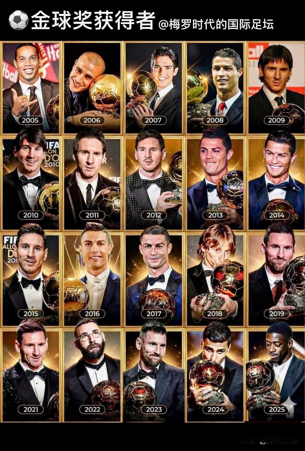 2005-2025跨越1/5世纪的梅罗时代🔥🔥 2005年巴西罗纳尔迪尼奥、 2006年意大利卡纳瓦罗 2007年巴西卡卡 · 2018年克罗地亚莫德里奇 · 2022年法国本泽马 · 2024年西班牙罗德里 2025年法国登贝莱 罗纳尔迪尼奥 小罗 皇马巨星c罗 C罗环球奖 c罗世界纪录