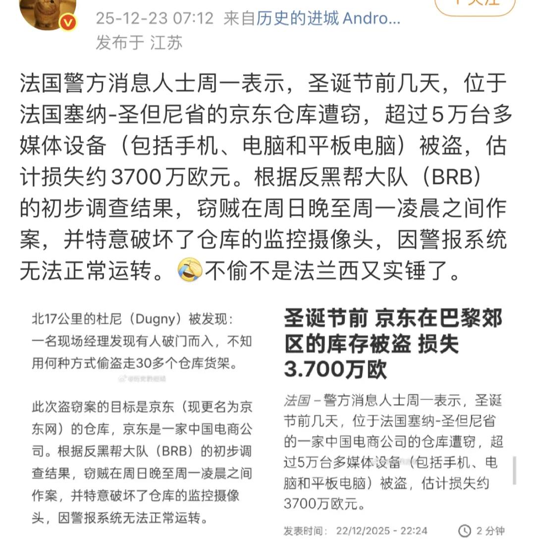 12月23日消息,北京时间 12 月 22 日,位于法国巴黎地区的京东仓储遭遇盗抢,当地警方已介入调查处理。23日晚间,京东回应称,目前仓库已恢复正常运营,相关方面披露的“重大损失数据”与实际情况有较大出入。京东表示,近年来,京东加速推进“全球织网计划”,已在全球 23 个国家和地区建设了超 130 个各类型海外仓,并合法合规运营。“我们将持续建设好超级供应链,为广大企业和用户提供高质量的物流服务。”(柴狗夫斯基、IT之家)