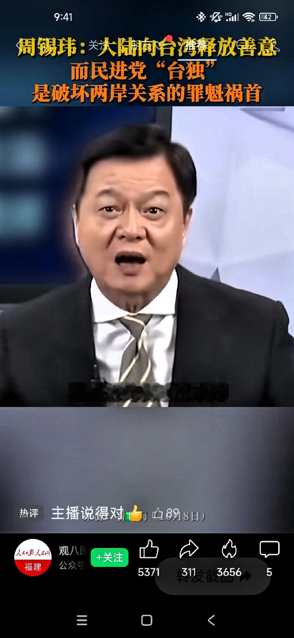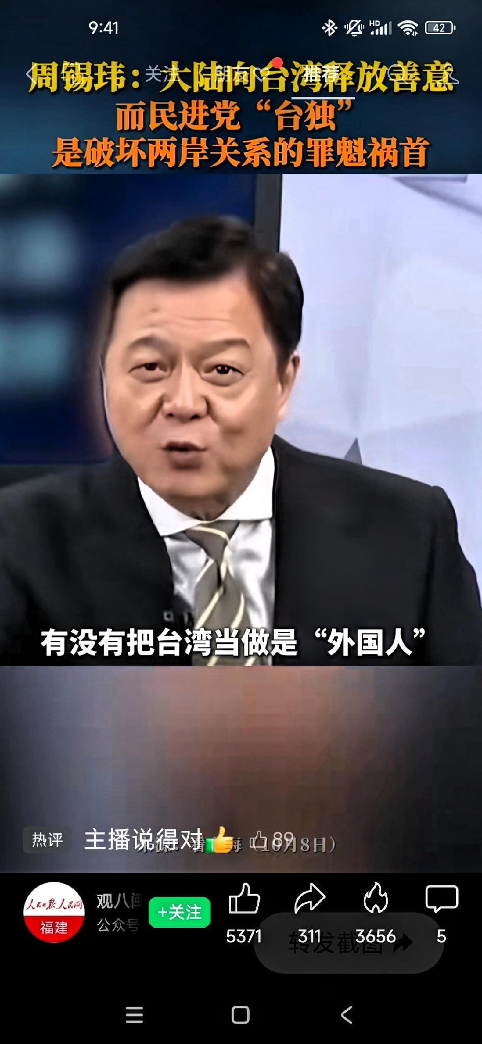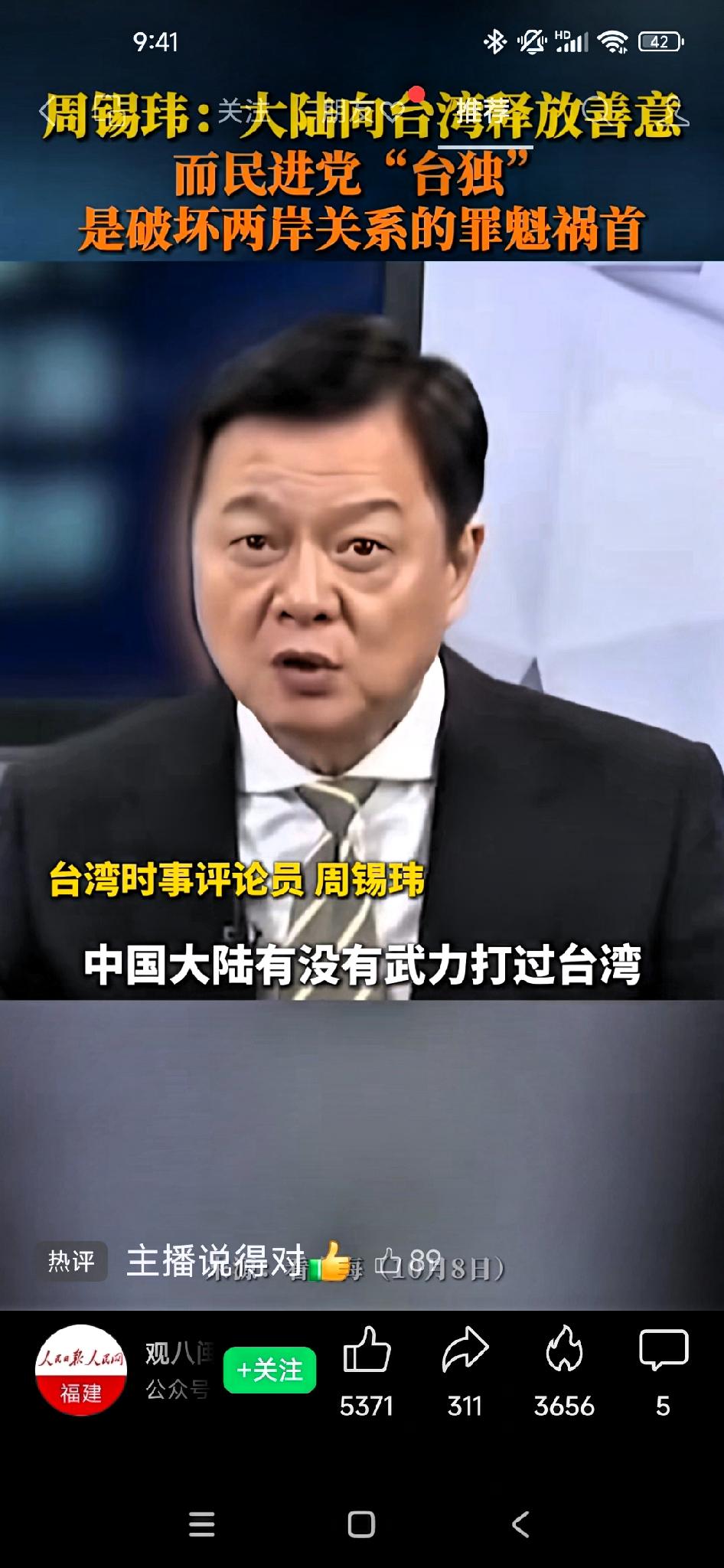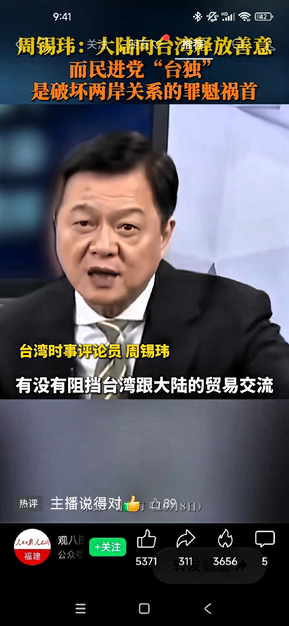 周锡玮:大陆向台湾释放善意,民进党“台独”是破坏两岸关系的罪魁祸首。 一 中国大陆有没有武力打过台湾? 二 有没有阻挡大陆和台湾的贸易交流? 三 有没有把台湾当做是外国人? 都没有。 四 你要知道今天两岸的所有问题,是民进党制造出来的。 五 “台独”关起门来天天骂大陆,不是“抗中保台”,而是“抗中保毒”,是保民进党的“台独”!