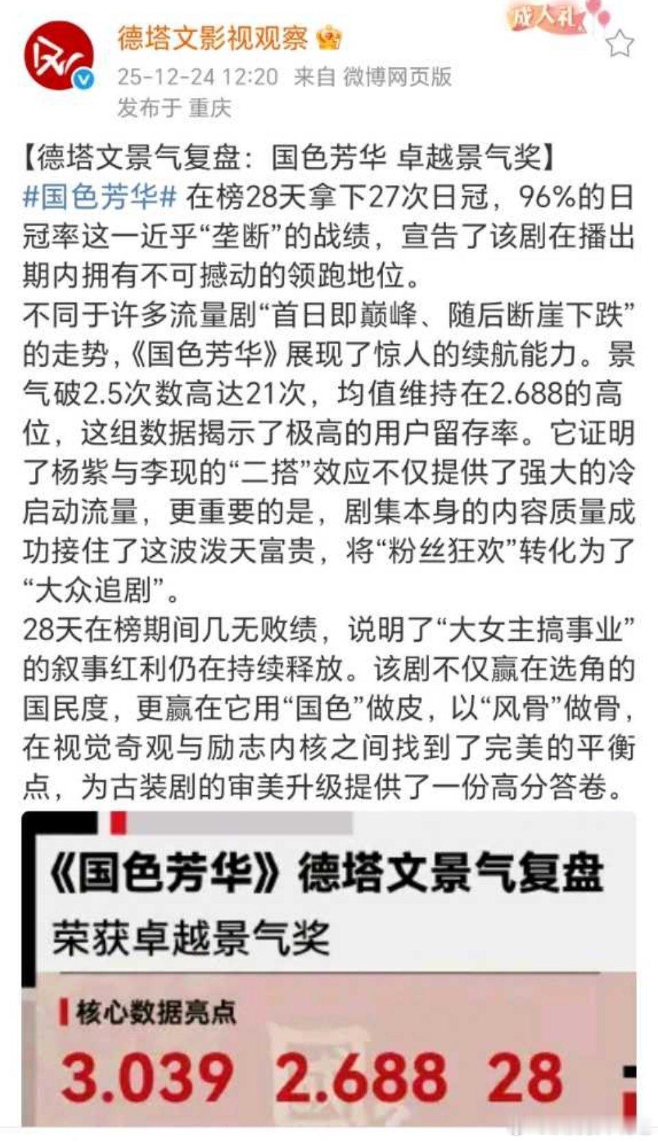 卓越景气奖德塔文如果不搞那个凑数的进来,我真觉得它还挺客观的,国色芳华毕竟是唯二破3的剧,各个榜单数据都很顶,结果德塔文非要媚粉凑数。