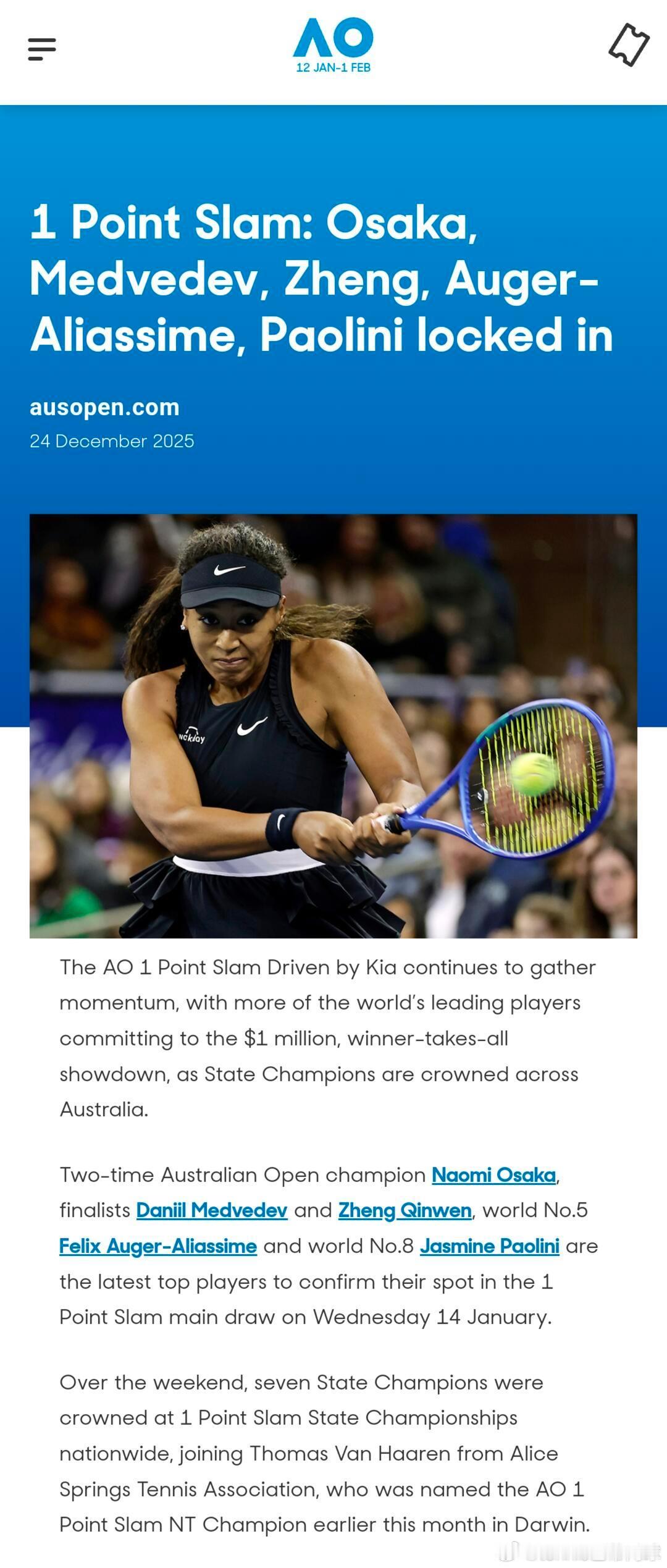 郑钦文将参加澳网一球制胜 澳网官方宣布郑钦文将出战“一球制胜”大满贯,这项全新的赛事将于明年1月14日进行,职业球员和业余选手通过打一分的方式进行淘汰赛,最终的冠军可以获得100万澳元的奖金!除了郑钦文之外,阿尔卡拉斯、辛纳、斯瓦泰克、高芙、梅德韦杰夫、大坂直美、阿利亚西姆和克耶高斯等职业球员也都报名参赛澳网2026wta