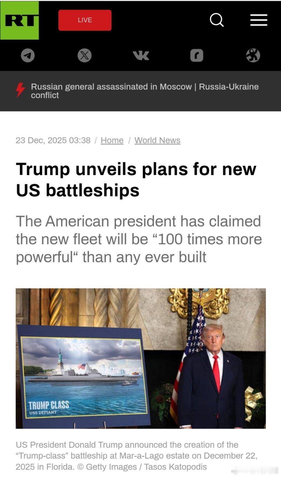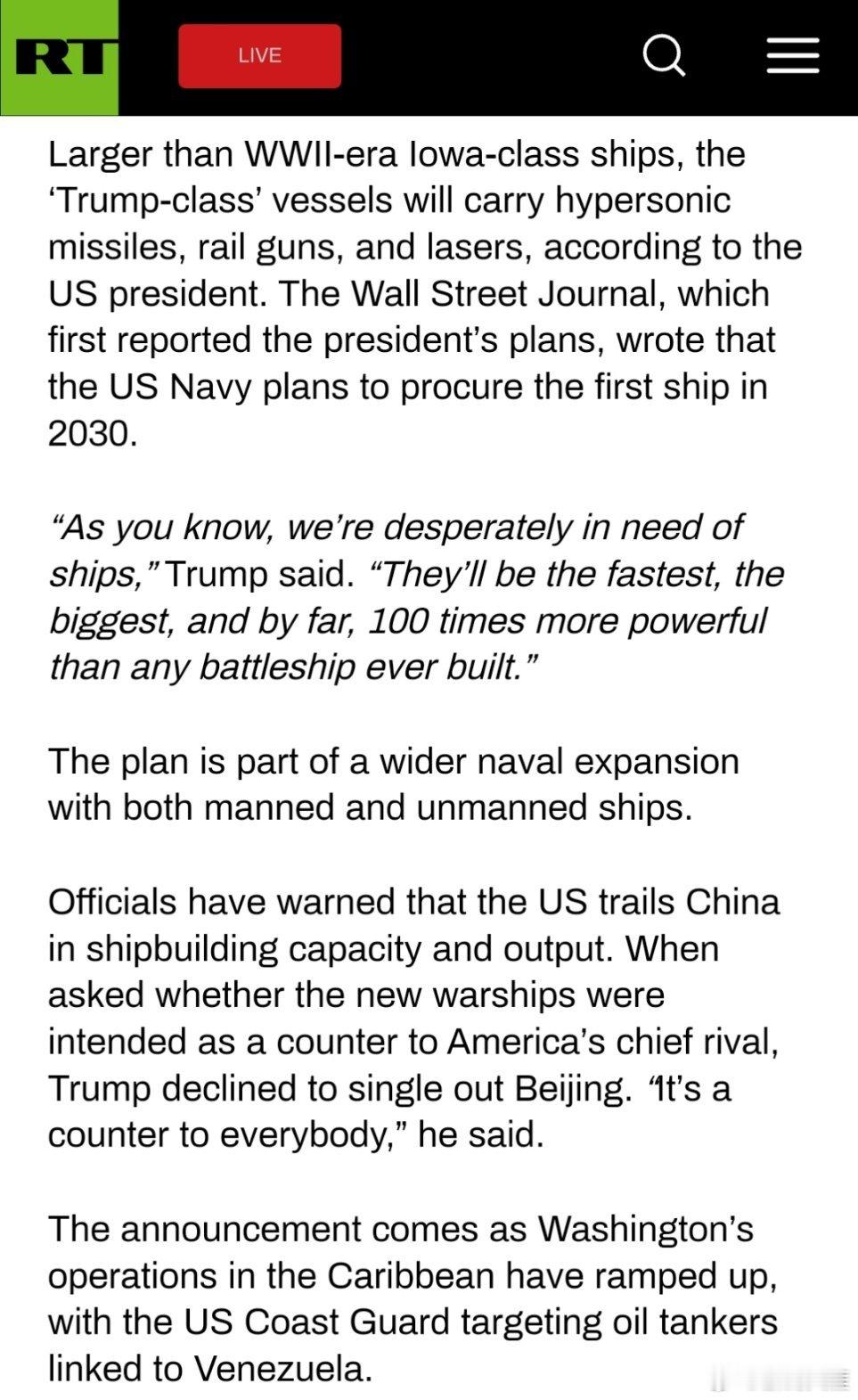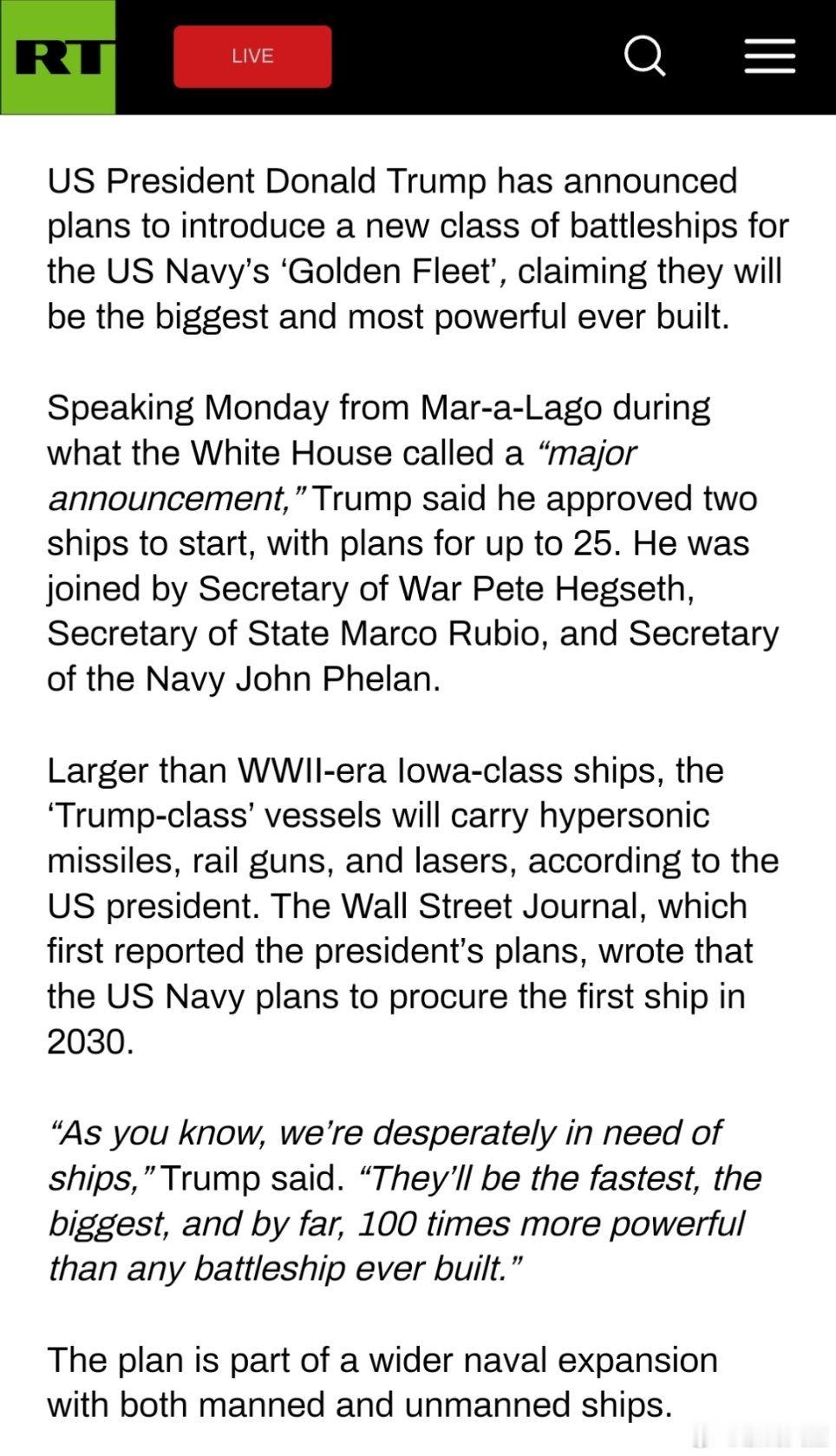 特朗普级战列舰特朗普公布美国新型战列舰计划美国总统宣称,这支新舰队的威力将是以往所建任何舰队的 100 倍。美国总统唐纳德·特朗普宣布计划为美国海军的“黄金舰队”引入新型战列舰,声称这些战舰将成为有史以来最大、最强大的战舰。周一在海湖庄园发表白宫所称的“重大声明”时,特朗普表示他批准了两艘舰艇的建造,计划最多建造 25 艘。国防部长彼得·赫格塞特、国务卿马尔科·卢比奥和海军部长约翰·费伦陪同出席。据美国总统称,这种“特朗普级”战舰的规模比二战时期的“爱荷华级”战舰还要大,它们将配备高超音速导弹、轨道炮和激光武器。最先报道总统这一计划的《华尔街日报》称,美国海军计划在 2030 年采购首艘此类战舰。“如你所知,我们迫切需要船只。”特朗普说道。“它们将是最快速、最大型的,并且其威力将远远超过以往任何一艘战舰,足足是其 100 倍。”该计划是大规模海军扩张计划的一部分,其中包括有人驾驶和无人驾驶的船只。官员们曾警告称,美国在造船能力及产量方面落后于中国。当被问及这些新型军舰是否旨在对抗美国的主要竞争对手时,特朗普拒绝点名提及中国。他说:“这是针对所有对手的。”(今日俄罗斯RT网)