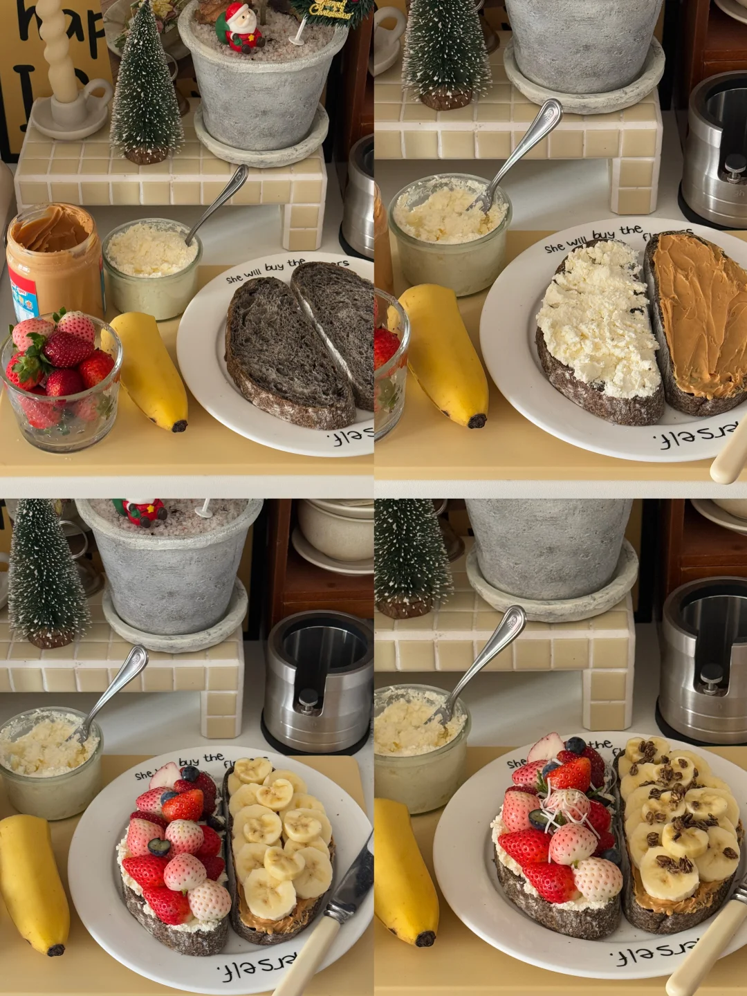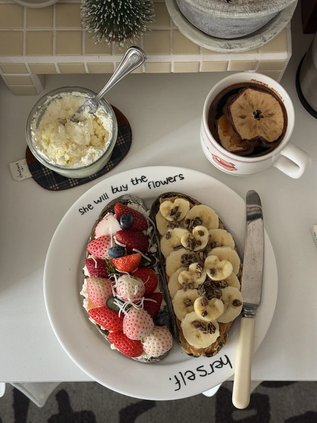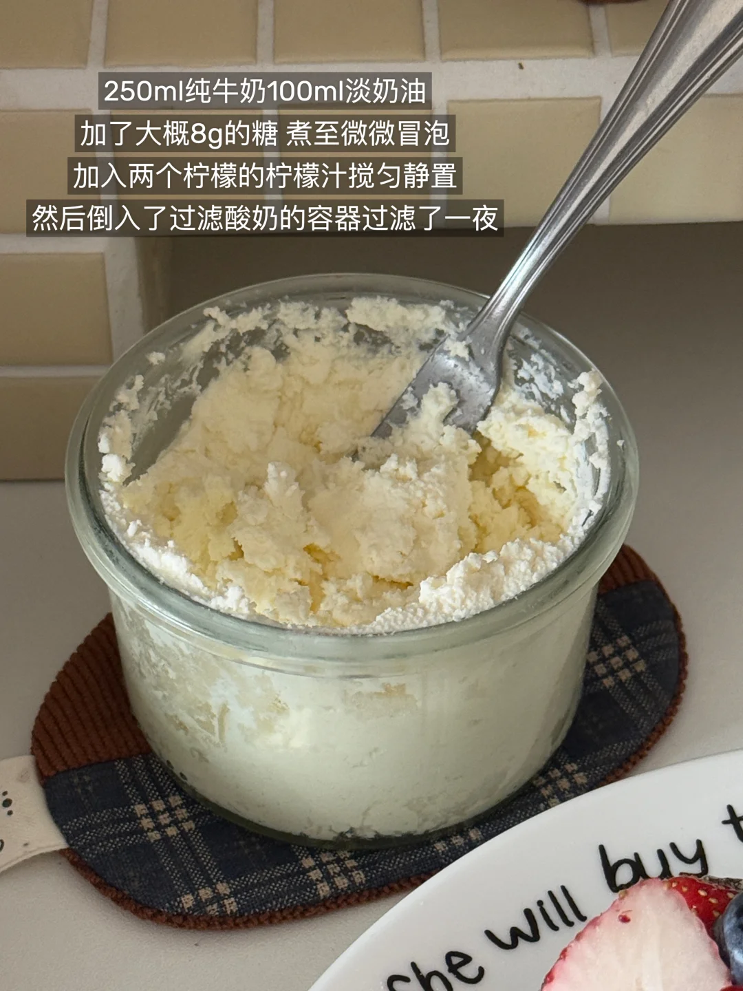奶酪不够自己动手做了ricotta🥛 怕酸加了一点糖 能吃到柠檬的香味 但不会酸🍋 - 一片欧包上抹上ricotta和草莓🍓🫐 一片抹上花生酱和香蕉片和少许燕麦片 - 一次get两款味道✔️ 真的不要太满足了[哇R]