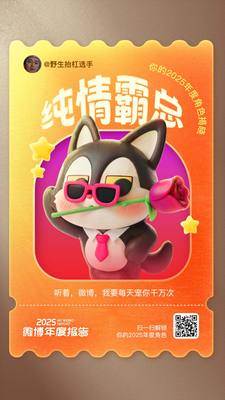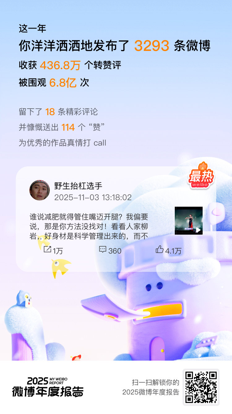 托你们的福,今年我保持金V成就276天 ,借你们的光,橙V保持了89天 !这份快乐也传递给你,速戳>>2025微博年度报告 ,解锁你的微博年度总结吧!微博年度报告微博之夜