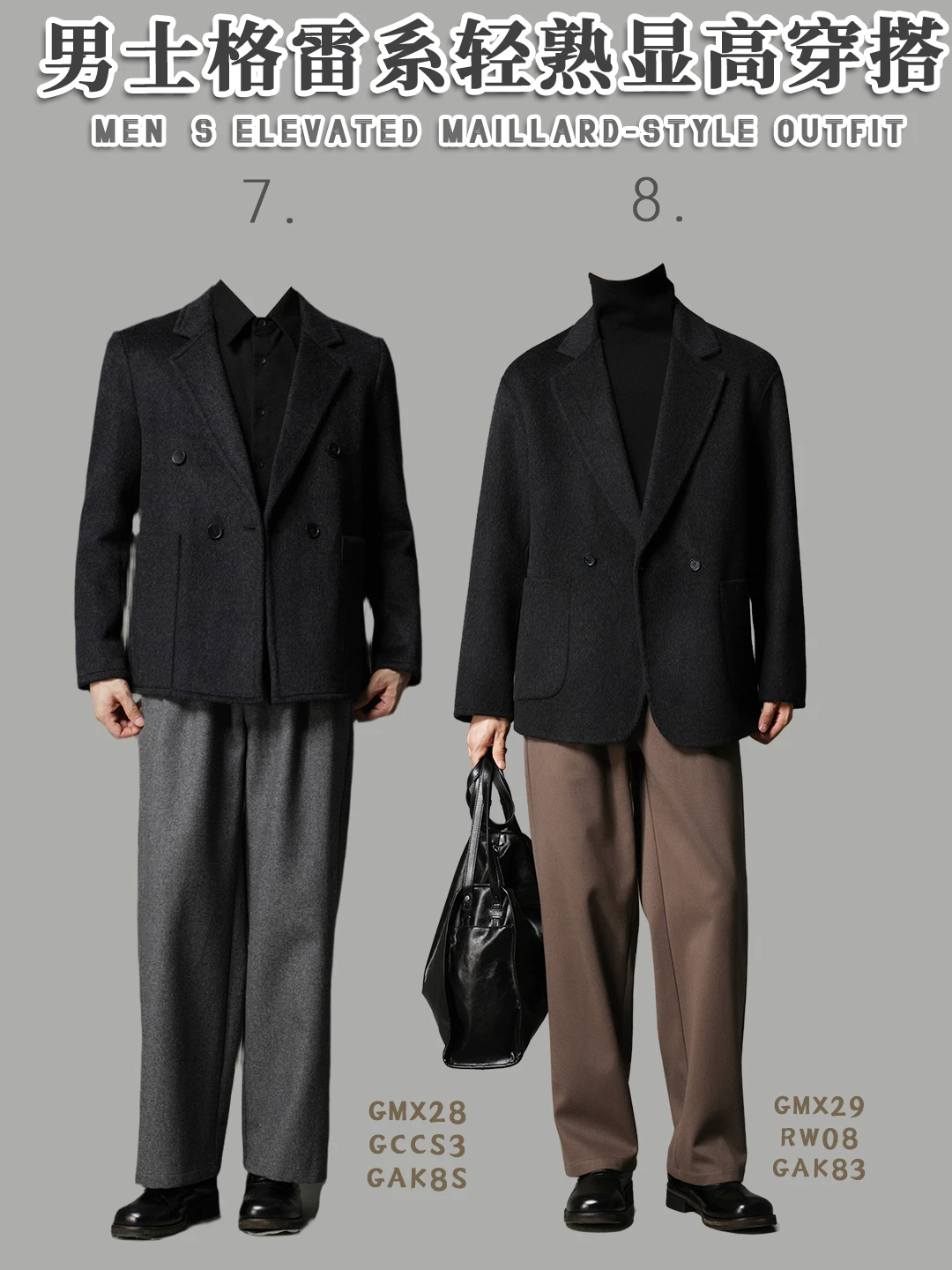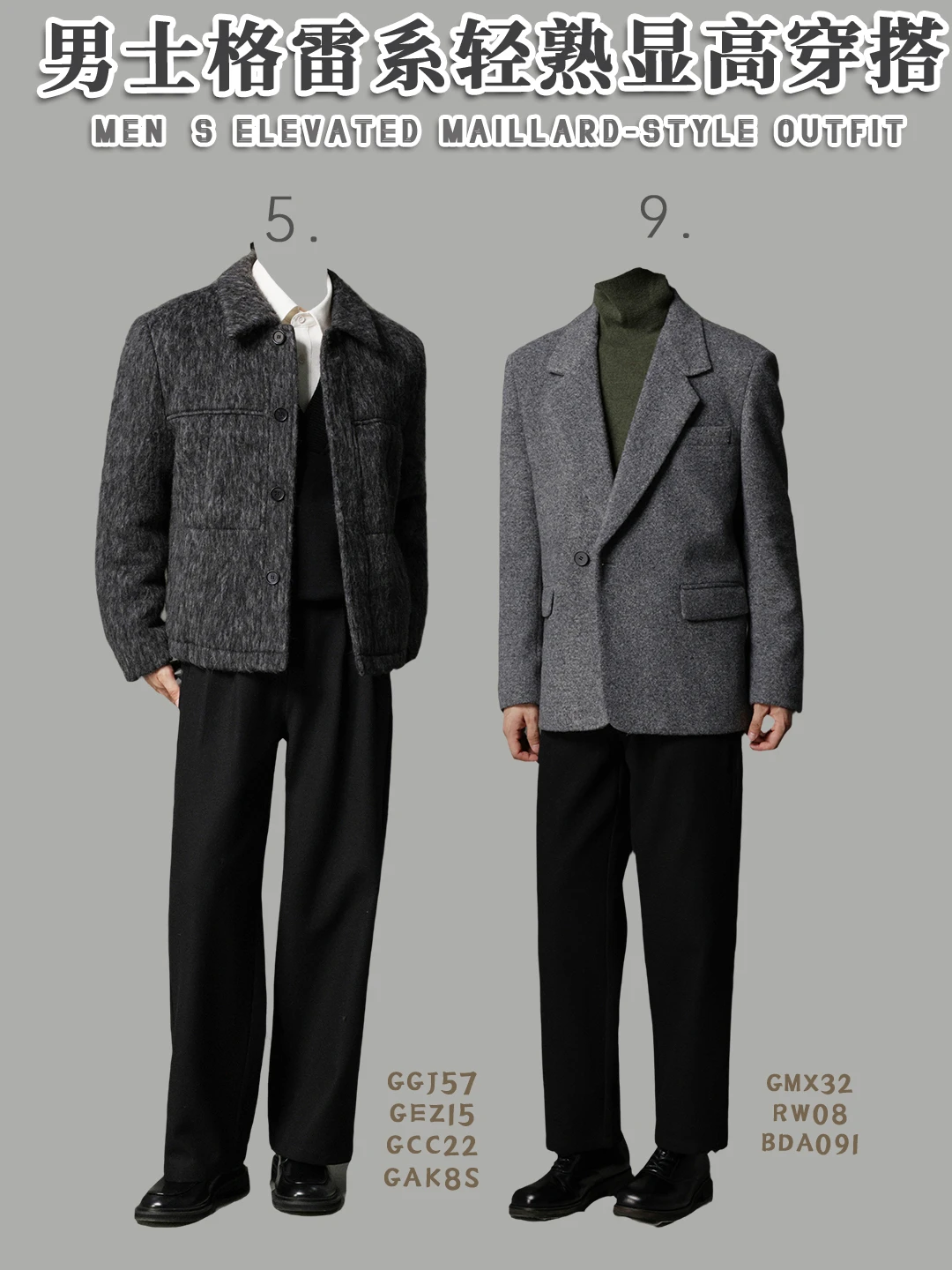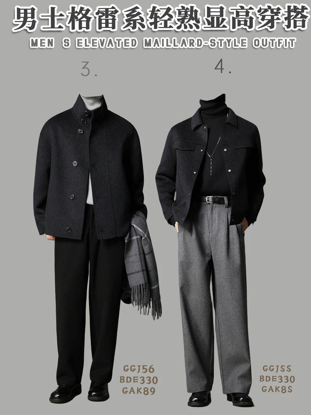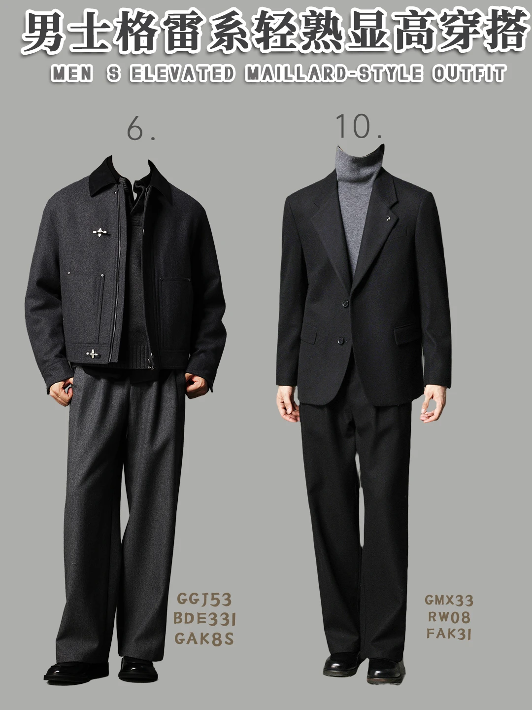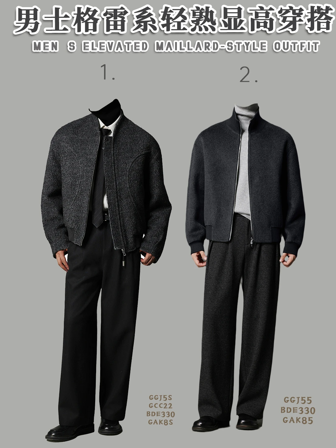 🧥「黑灰立领夹克 + 浅灰高领 + 黑阔腿裤」