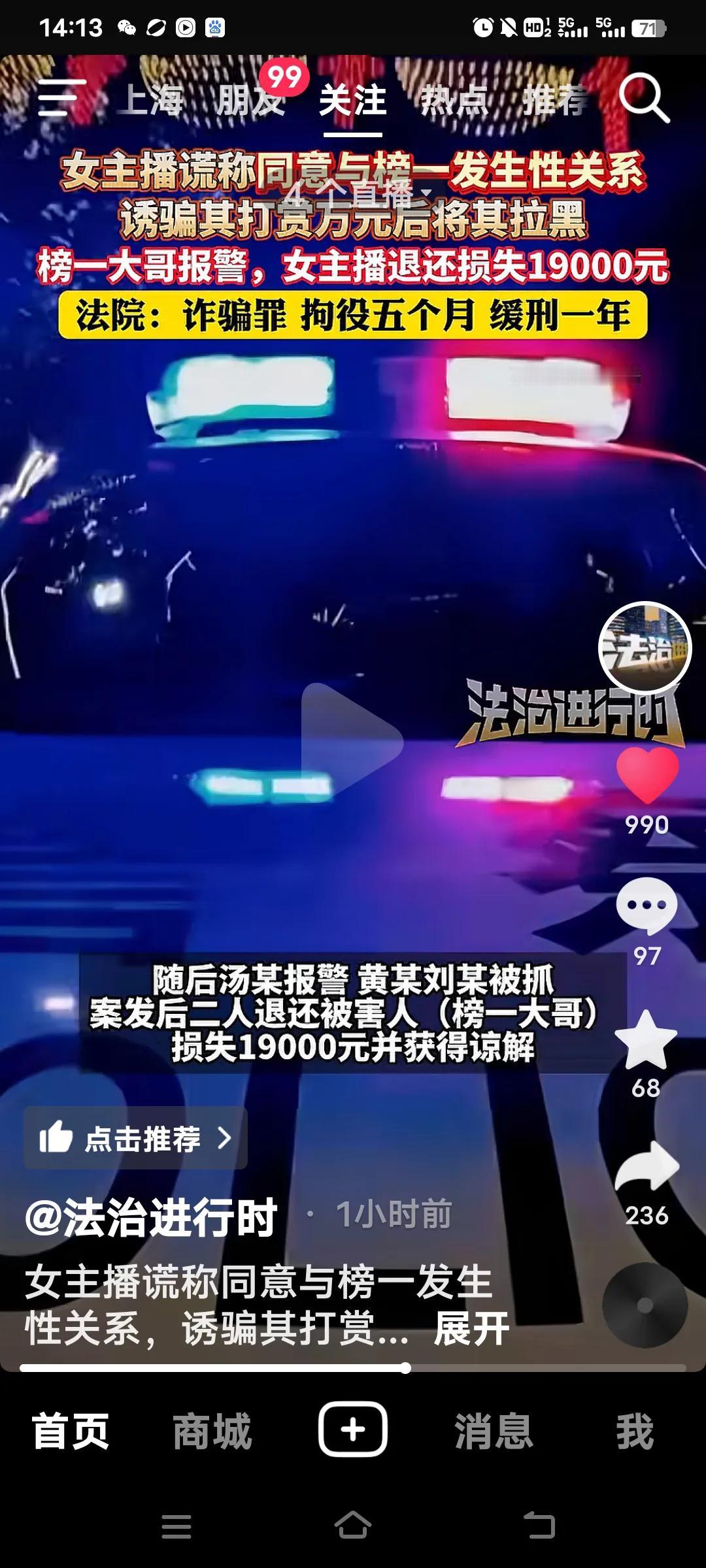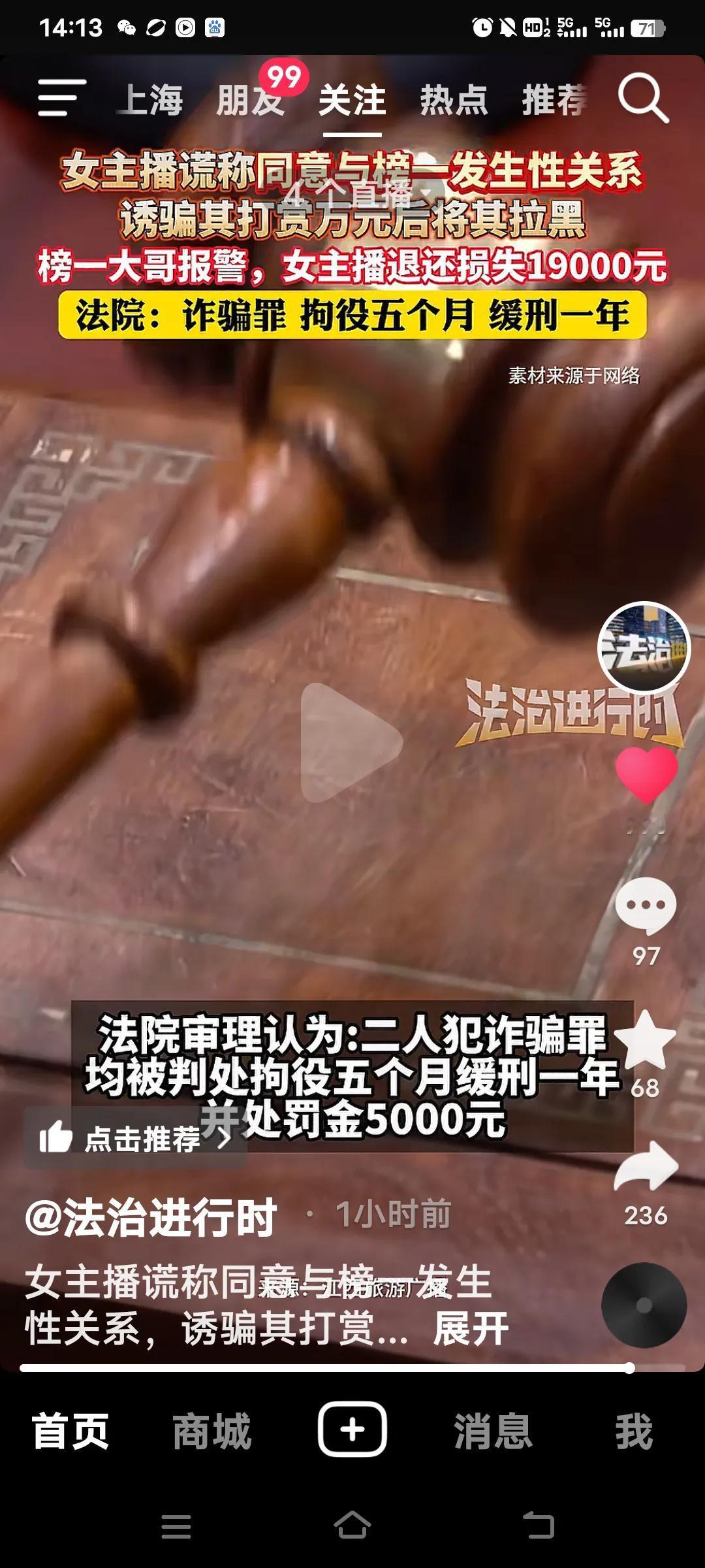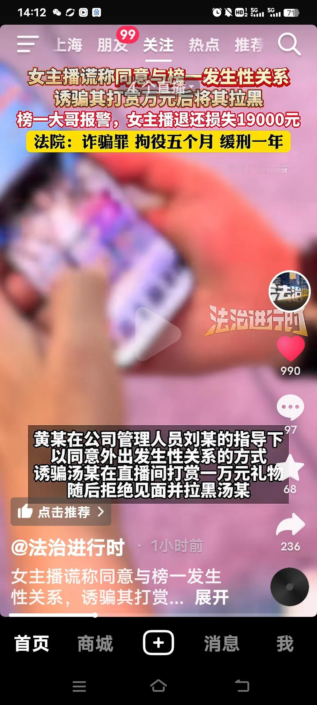 直播圈再现诈骗乱象!女主播黄某与公司管理人员刘某堪称“戏精”搭档。在刘某的指导下,黄某以虚假网恋和“同意发生性关系”为诱饵,诱使“榜一大哥”汤某打赏10000元,随后将其拉黑。汤大哥可不是好惹的,当即选择报警。 两人落网后退还了19000元,获得了汤某的谅解,但仍被法院判处拘役五个月,缓刑一年,并处以5000元罚款。此类事件并非个例,甘肃一家公司诈骗33人,涉案金额达28万余元,17人被判刑;甚至还有骗取未成年人打赏的情况。骗子深谙心理战术,大家观看直播时一定要提高警惕,别被“糖衣炮弹”迷惑。 说到底,凭良心赚钱才能心安理得,也不至于栽跟头。如此行径,实在是得不偿失,还惹人笑话。再者,靠这种手段赚钱的人,即便一时获利,也难以长久。而平凡人过着平凡的日子,未必就会遭遇挫折,大家说是不是这个道理?直播平台套路 直播间超级骗局 直播陷阱