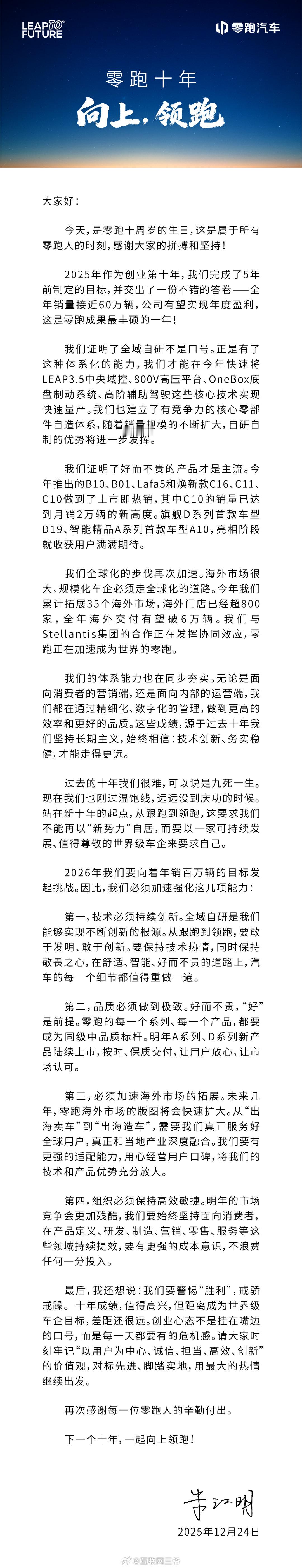 零跑汽车十周年创始人朱江明发布内部信:从跟跑到领跑,以世界级车企要求自己!从2015到2025,这十年是中国新能源车从追赶到领跑的黄金期,也是零跑从行业“门外汉”一路突围成头部品牌的奋斗史。创始人朱江明在内部信里说得很实在:“过去十年九死一生,现在刚过温饱线,远没到庆功时。”这种清醒特别可贵。 2025年零跑预计全年销量近60万辆,海外交付6万辆,累计销量破120万辆,还首次实现季度盈利,成绩亮眼。更关键的是,它靠全域自研(比如LEAP3.5中央域控、800V高压平台这些硬核技术)和“好而不贵”的定位,用技术创新把成本打下来,让消费者得实惠,同时保持健康毛利,这模式很有看点。12月28日杭州小莲花的十周年发布会,朱江明会系统回顾过去、展望未来,还可能揭秘旗舰D系列,值得期待。从“理工男”到“长期主义者”,零跑这十年靠技术沉淀和踏实做事,走出了一条“逆网红化”的路——不追流量,只凭实力赢得用户长久信赖。下一个十年,它定下2026年百万销量目标,要向世界级车企迈进,这份野心和脚踏实地的劲儿,值得点个赞!