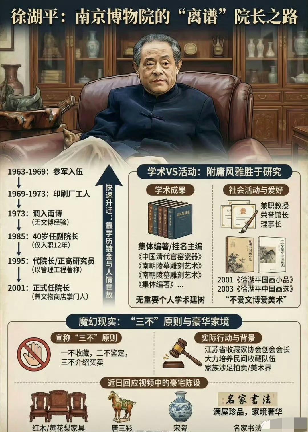 徐湖平一个印刷厂工人竟然能做南京博物馆馆长,不管是馆藏还是规模,南博都是国内排名前列的,一个纯外行,毫无学术背景,专业素养,他是怎么当上馆长的呢?看他的履历,当兵6年,转业印刷厂做了4年工人,进入南博,12年后升任副院长,2001年正式成为院长直至退休。皮裤套棉裤,必有缘故。南京博物馆印章 南京学者