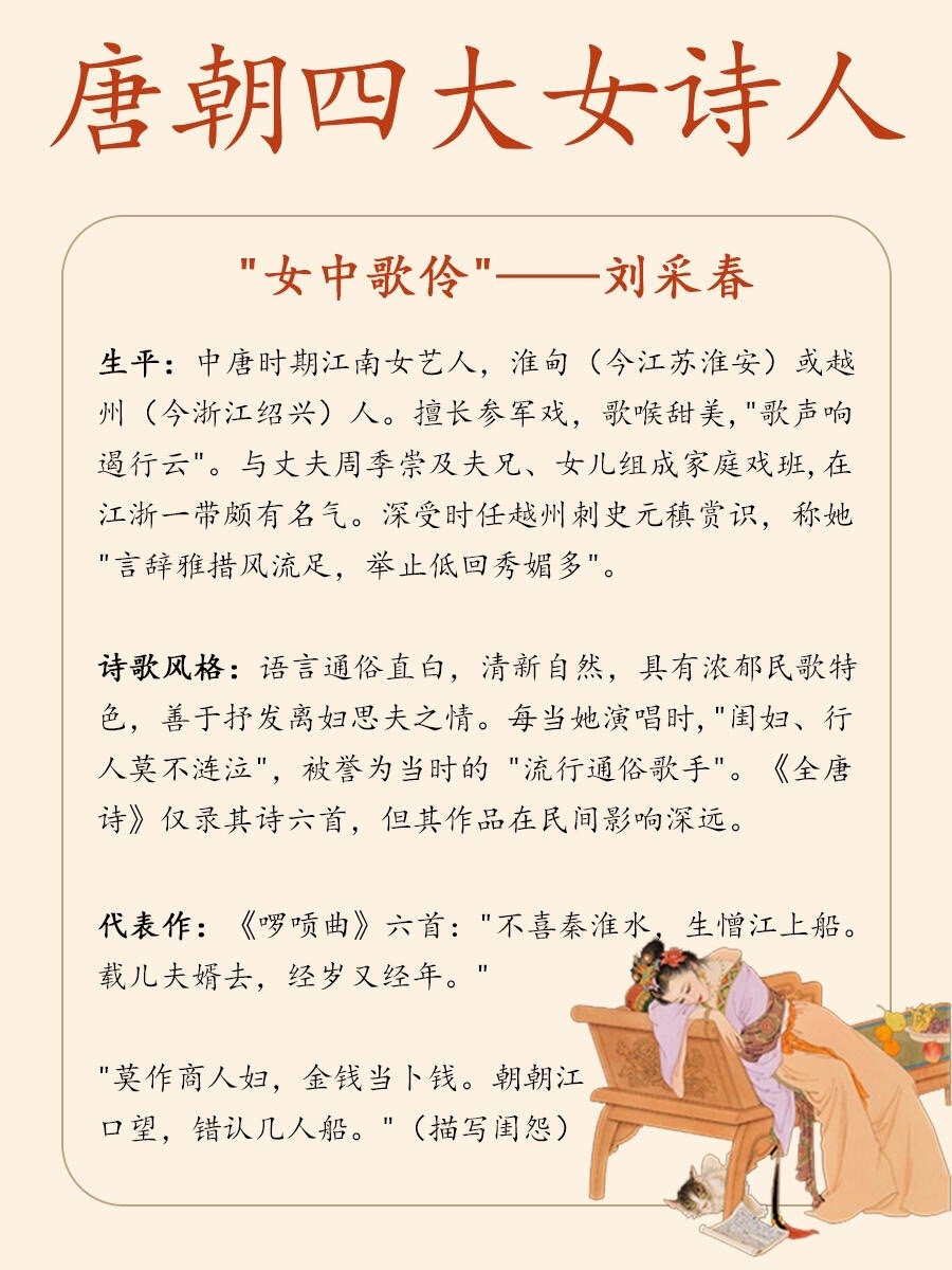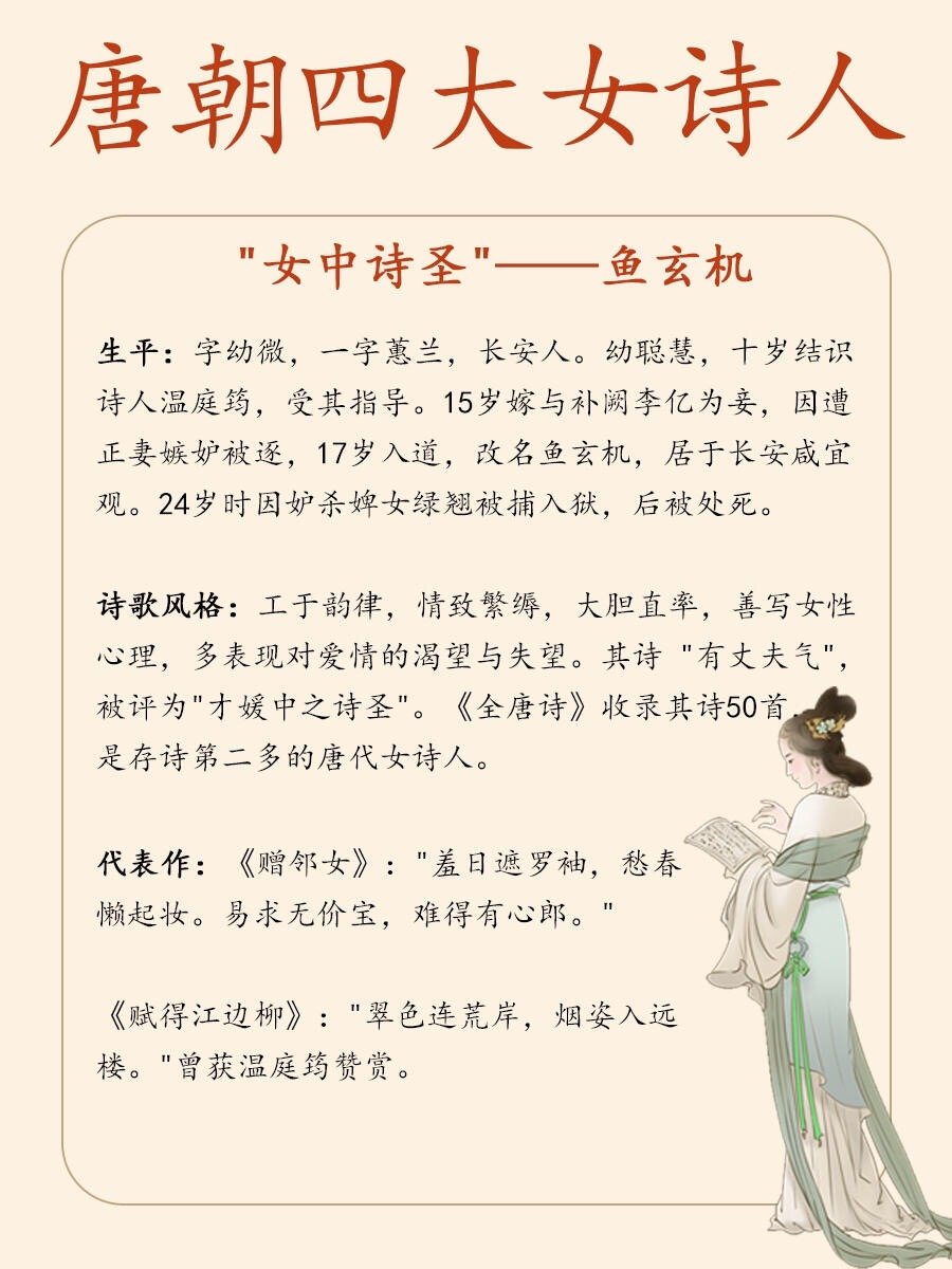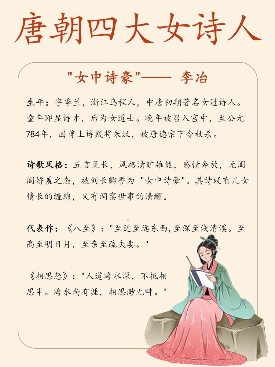 唐朝四大女诗人,你知道谁?这四位才女虽出身不同,命运各异,但均以非凡才华打破了唐代女性的社会局限,在诗歌领域取得了与男性比肩的成就:●李冶开女冠诗豪放之风,其哲理诗对后世影响深远●薛涛创立 "薛涛笺",其诗歌风格被视为女性文学典范●鱼玄机大胆抒发女性情感,成为女性意识觉醒的先驱●刘采春将诗歌与音乐融合,开创了通俗文学新形式她们共同证明了唐代女性在文学创作上的卓越才华,为中国古代女性文学树立了丰碑,其作品至今仍散发着独特的艺术魅力。历史知识历史那些事