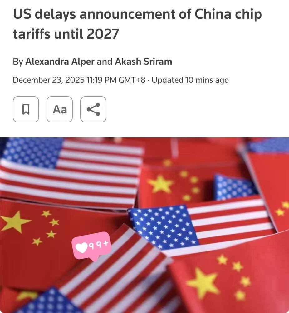 美国突然宣布 美国特朗普政府表示,将因中国“以不合理方式追求半导体产业主导地位”而对中国进口的半导体产品加征关税,但具体措施将推迟至2027年6月实施,关税税率至少提前30天公布。 这牌出得够慢的。宣布要加税,但告诉你一年半以后再谈具体怎么加。这不像制裁,倒像发了个“预告片”。 华盛顿自己也明白,这刀太快了容易伤到自己。美国很多电脑手机里都有中国芯片,立刻加税,美国厂商的成本“噌”就上去了。消费者买手机电脑,可能得多花一笔钱。所以他们先举着刀,看看形势。 更厉害的杀招其实在别处。关税是明枪,出口管制才是暗箭。美国正盘算着,要把三星、SK海力士这些外国公司在华工厂的设备出口豁免给取消掉。这招更毒,是想从生产线上卡住你的脖子。 美国内部也不是铁板一块。今年7月,美国刚批准了AMD和英伟达向中国出售一些AI芯片。这说明什么?说明美国芯片公司也离不开中国市场,少赚钱他们也肉疼。 对中国来说,这就是一场倒逼。你越封锁,我越要自己造。国家集成电路产业投资基金(大基金)三期,规模高达3440亿元人民币,钱正往最薄弱的设备、材料环节涌。 看看长江存储的产线就知道了。以前清一色的外国机器,现在国产的刻蚀机、清洗设备,一台台正在往里搬。市场份额的数据不会骗人,国产设备在成熟制程里的地盘,正在一点一点变大。 美国人把2027年当作一个时间点,觉得能给自家产业争取时间,让苹果这样的公司把生产线搬回去。他们心里也打鼓,波士顿咨询公司早就警告过,强推产业回流,可能反而让美国在全球芯片业的地位下滑。 这场博弈里没有傻子。中国这边也没闲着。早在今年9月,中国商务部已经正式启动了对美国半导体领域歧视性措施的调查,依法保留采取相应措施的权利。这就是告诉对方,我手里也有牌。 所以,这张延迟的关税牌,本质是谈判的筹码。它把眼前的冲突,拉成了一场比拼耐力的马拉松。一边是封锁与遏制,另一边是突破与自主。每一方都在赌,赌时间站在自己这边。 各位读者你们怎么看?欢迎在评论区讨论。
