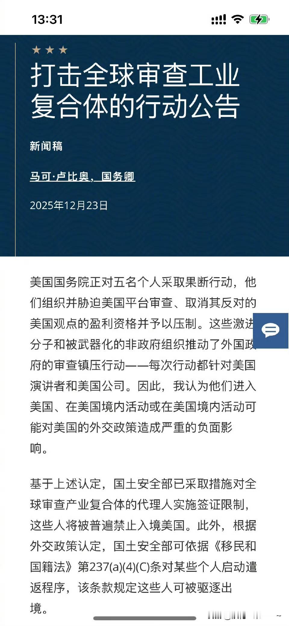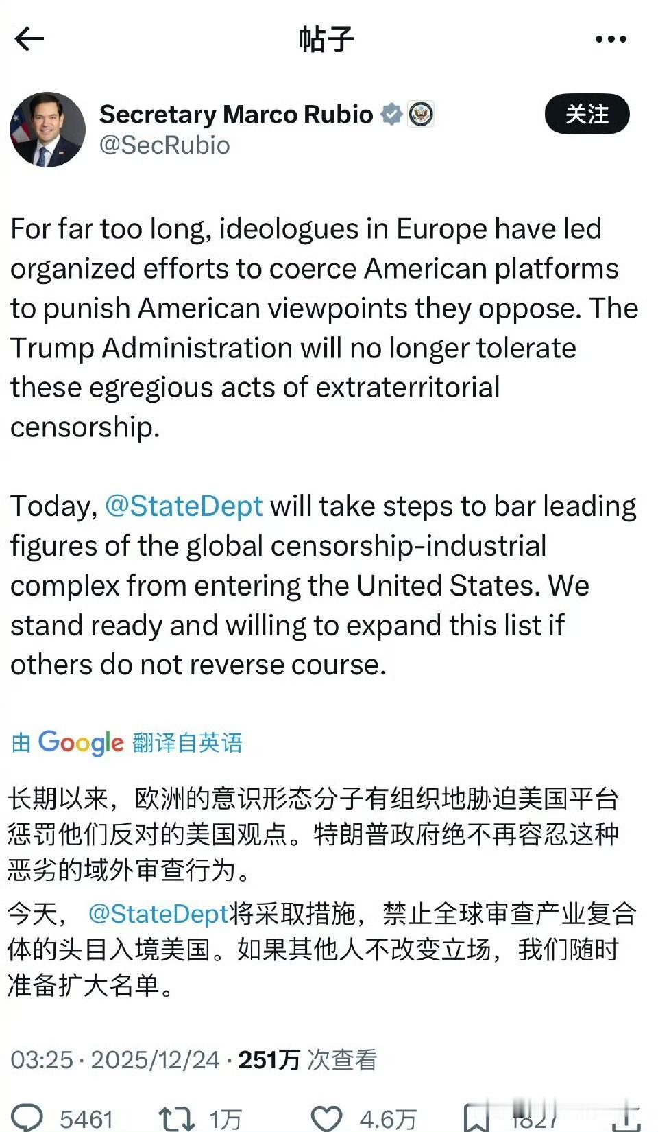 掀桌子了? 鲁比奥,发飙了?[捂脸]开始打击全球特别是欧洲审查工业复合体的行动! 起因也很清楚了,就是欧盟对马斯克的x平台进行了罚款,美国政府心里不舒服了。 美国政府的意思就是美国人利用X平台进行美国意识形态宣传是言论自由,是正确的,而你们你们欧洲不能阻止!再带头阻止,对美国企业进行不公正对待,就禁止你们入境美国。
