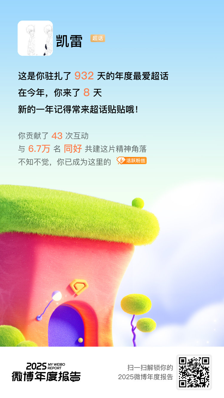 微博年度报告 毫无悬念,我的年度TOP1超话必须颁给凯雷 !这里是同好基地,是永远的家!速来>2025微博年度报告 看看你最爱的那个超话吧!微博之夜