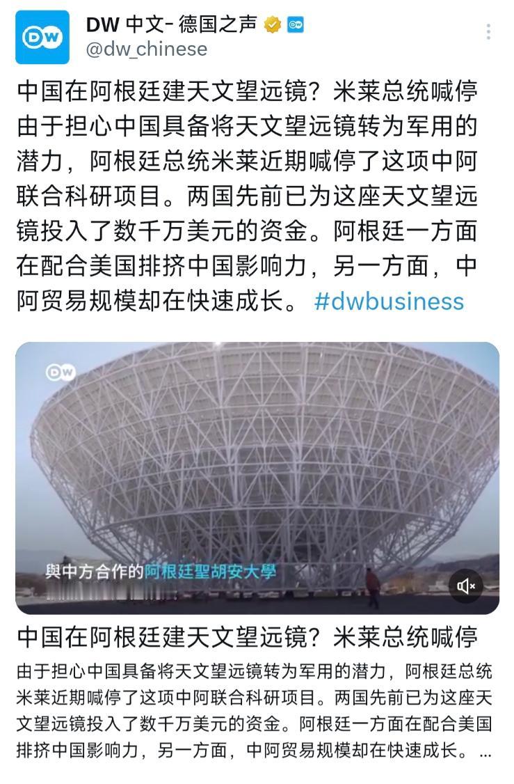 阿根廷又开始左右摇摆了!12月23日,德国之声发文:“阿根廷总统米莱近期喊停了这项中阿联合科研项目,理由是担心中国具备将天文望远镜转为军用的潜力。阿根廷一方面在配合美国排挤中国影响力,另一方面,中阿贸易规模却在快速成长。” 说白了,阿根廷之所以暂停项目,根本就不是在担心中国会将天文望远镜转为军用,而是在讨好美国。 要知道,阿根廷有很严重的债务危机,极度依赖美国的资金援助,而美国财长本打算12月进行阿根廷访问,但是却临时取消,这加大了阿根廷对债务的担忧,使得阿根廷不敢再得罪美国。 但说实话,望远镜起初的目地是用来服务科研的,对军事的用处可以说非常微弱,阿根廷现在是两边都不想得罪,暂时的暂停项目,只是为了能平衡两边的关系,项目估计要不了多久项目还是会继续。毕竟中国和阿根廷的合作也非常多,真真切切的让阿根廷经济实现了上涨。 说到底,阿根廷这次暂停中阿联合天文望远镜项目,其实是在用科研利益换美国短期援助,但是却让阿根廷陷入了 “讨好美国必损自身”的矛盾之中,这种左右摇摆的平衡术不仅很难维持,最终还可能会让阿根廷在大国博中失去更多的主动权。