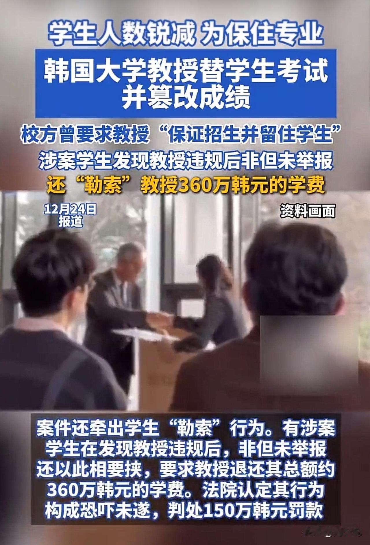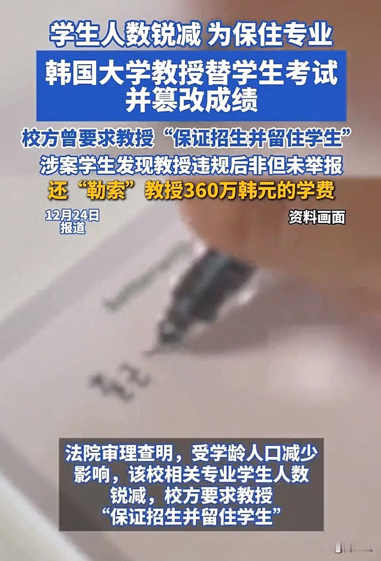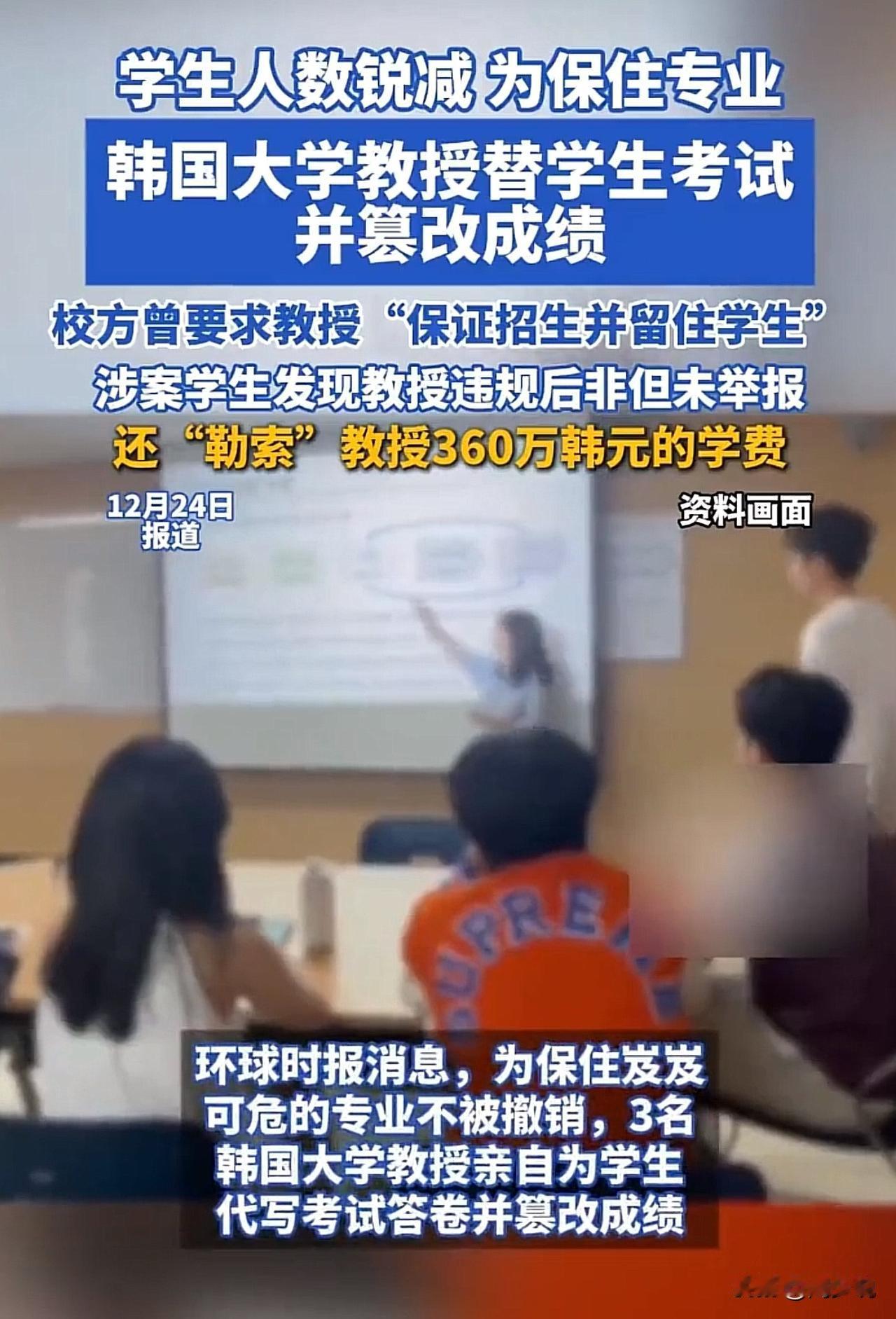 “简直离谱!”韩国一所大学,因为学生人数锐减,一些专业面临被裁撤的风险。为了“保住专业”,三位教授竟然替学生考试、篡改成绩,甚至还被学生勒索360万韩元学费,这波操作,直接把全网都看懵了…. 据报道,该校曾对教授提出要求:要“保证招生并留住学生”。在这种考核压力下,这名教授选择了一条最不该走的路,替学生考试、改成绩,用造假去换“数据好看”。 更讽刺的是,当学生发现教授违规后,非但没有举报、没有拒绝这种“假成绩”,反而反过来勒索教授,要求支付360万韩元的“学费”。 这件事在网上引发热议。有网友说:“这已经不是教育,而是一场集体堕落。教授丢了底线,学生丢了良心,学校丢了责任。” 也有网友指出:“考核压力再大,也不能拿公平和诚信做交易。大学是最后一道教育防线,这里塌了,对社会的伤害是长期的。” 还有人感叹:“学生敢勒索老师,说明他们根本不把学术诚信当回事,这比成绩造假本身更可怕。” 在周少看来,这件事暴露出的,不只是一个教授的错误,而是教育生态的严重扭曲。当“保住专业”“提升指标”被放在诚信和公平之前,教育就已经变味了。 当学生把老师的违规当成“把柄”,而不是警醒,我们就不得不担心,这一代年轻人的价值观正在被什么一点点侵蚀。 真正的教育,不只是教知识,更是教底线、教敬畏。大学可以因为生源减少而调整专业,但绝不能用造假去“续命”;学生可以成绩不好,但不能拿违规当筹码。 希望这件事,能给所有教育者和家长敲响警钟:别再只盯着“能不能保住专业”“能不能出成绩”,更要问问自己,我们到底想培养什么样的人? 一个没有底线的“人才”,也许能一时获利,但最终会反噬整个社会的信任。守住教育的底线,才是对孩子、对未来最大的负责。#寻美三湘# #长沙新朋友#