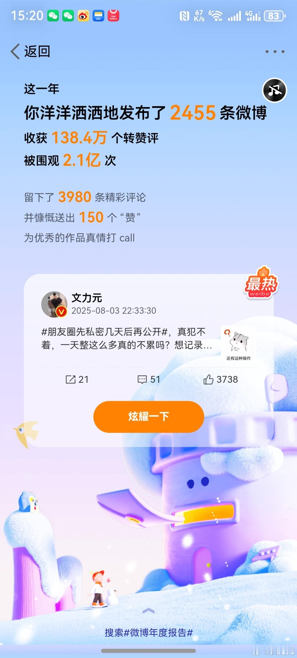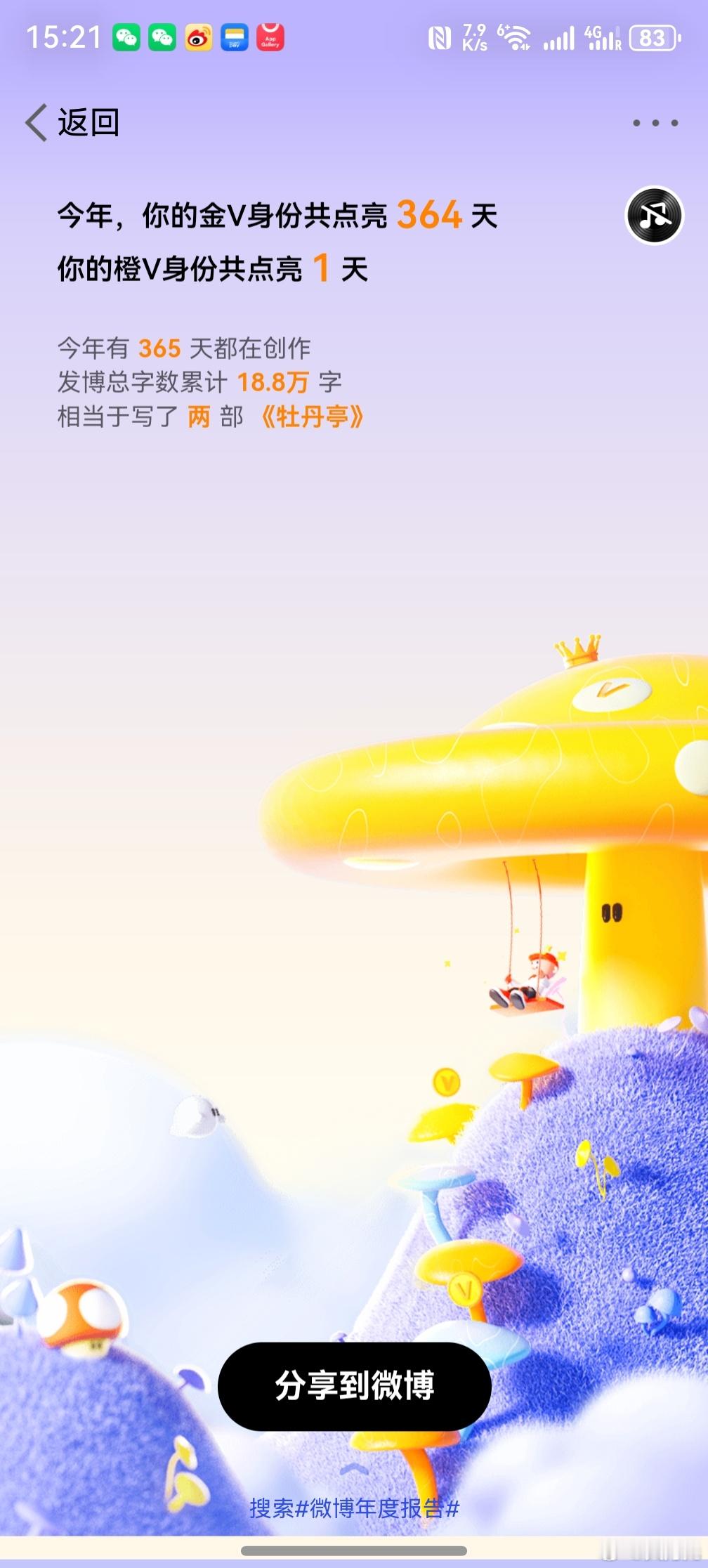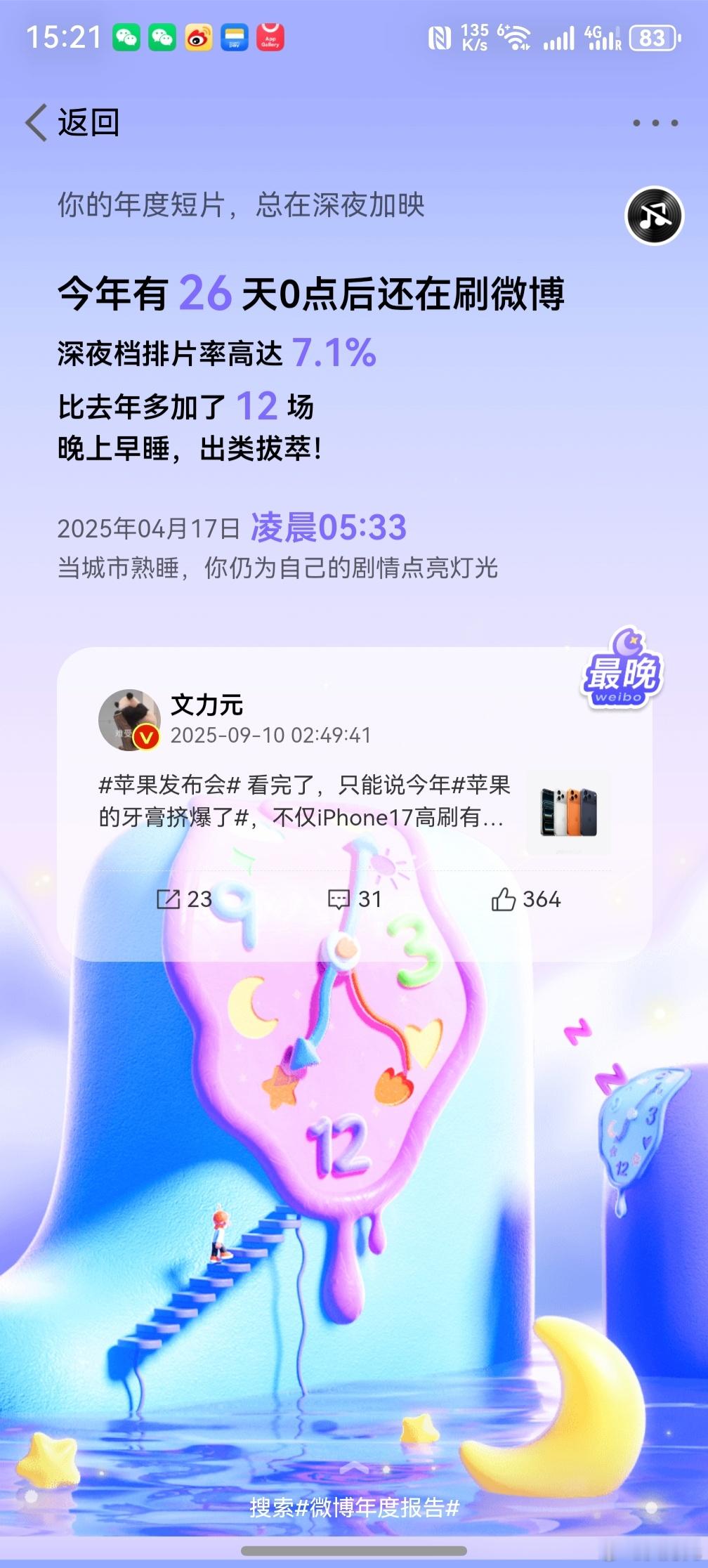 微博年度报告 ,好家伙,不看年度报告不知道,看了才知道自己这一年其实还挺勤奋的,天天刷微博,凌晨之后还在刷。