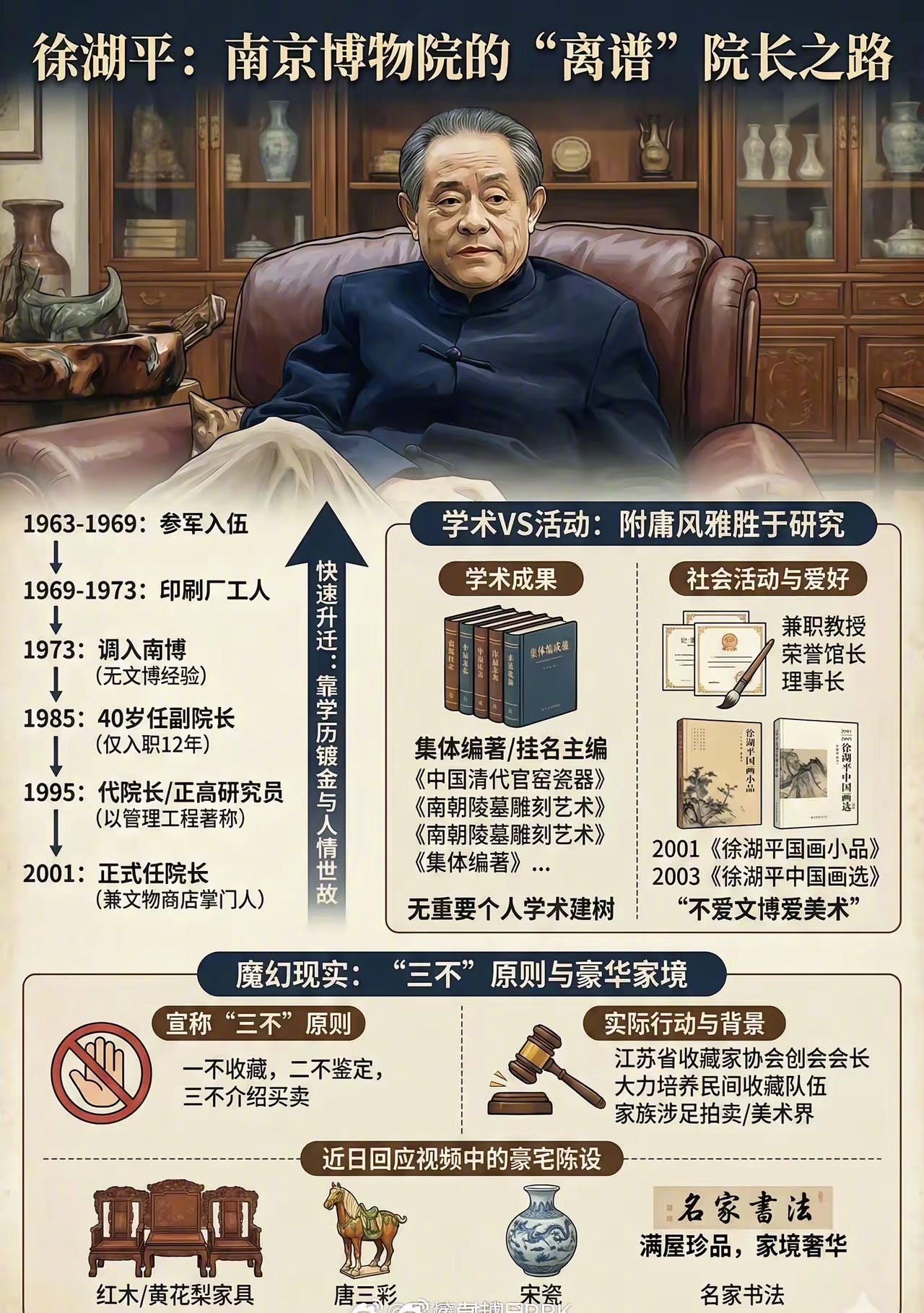 老子馆长,儿子拍卖行。徐湖平被扒,看了下履历,没有相关经验啊,完全是外行人士。