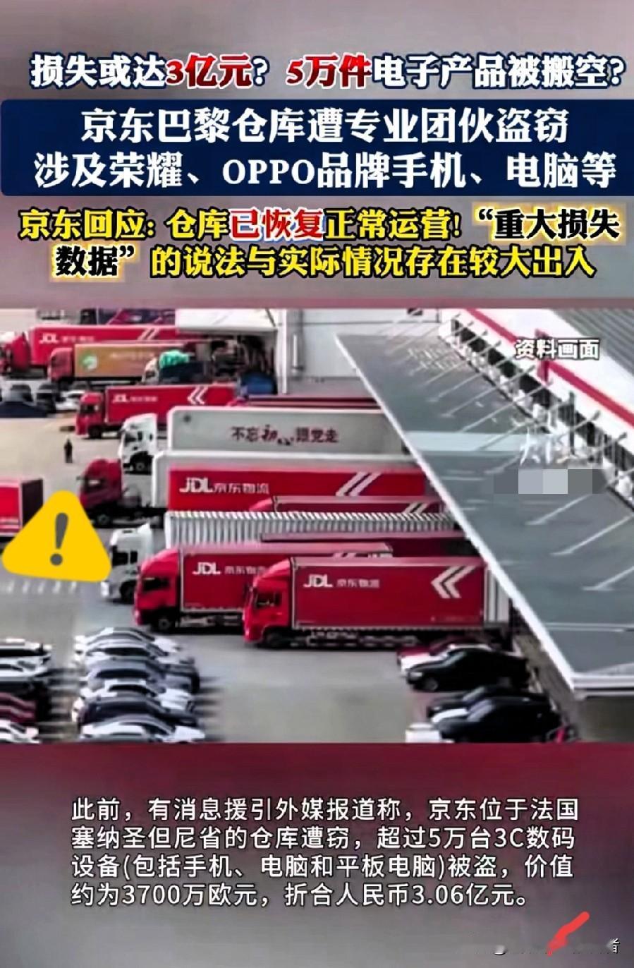 谁能想到,京东巴黎仓被盗案的真相,比网传的“3亿损失”更让人毛骨悚然! 官方最新回应来了: 网传被盗5万台3C设备、损失超3亿元的说法与实际出入较大,涉事仓库也已经恢复正常运营,核心物流履约没受长期影响。但比起被夸大的损失金额,这伙盗贼的作案手法,才是真正让所有仓储企业后背发凉的关键! 这哪里是普通盗窃,分明是有组织、有预谋的“精准猎杀”!他们早就摸透了法国物流行业的软肋——周末值守松懈,专门挑在21日周日晚到22日周一凌晨动手。为了万无一失,团伙提前两周就伪装成清洁人员混进仓库,把轮班规律、巡逻路线、安防死角摸得一清二楚。 作案时更是步步惊心:先切断外围供电箱让监控和警报系统瘫痪,再用液压钳暴力破坏三处应急入口,全程掐着巡逻间隔的27分钟黄金时间高效操作。更离谱的是,他们还带着RFID写入器,直接篡改货物托盘标签,让仓库系统误以为“货物正常出库”,甚至连运货的货车都伪造了京东物流的车牌,整套流程行云流水,专业到让人咋舌! 目前法国警方已经以“有组织盗窃”立案,专门的打击团伙犯罪大队也介入侦办。这件事也给所有跨境仓储企业敲响了警钟:海外仓安防绝不能有半点侥幸心理!周末值守力量薄弱、应急入口防护不到位、系统标签容易被篡改……这些看似不起眼的漏洞,都可能成为专业盗贼的突破口。建议相关企业赶紧升级安防系统,增加夜间和周末的巡逻频次,给应急入口加装更坚固的防护装置,同时完善货物出库的双重核验机制,从源头堵住风险。 毕竟,比起事后止损,提前设防才是王道! 你觉得海外仓库还能从哪些方面升级安防,才能防住这种高智商盗窃团伙?评论区聊聊!