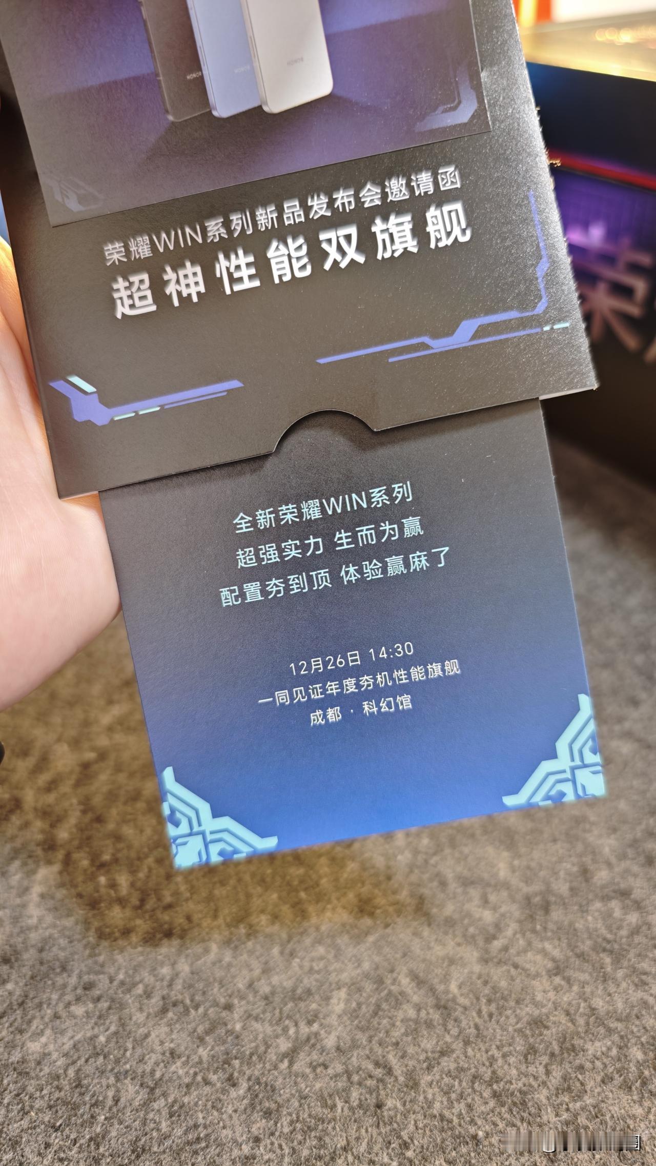 荣耀WIN发布会邀请函是一个抽卡式卡片,一抽一拉满屏都是顶,最后一页赫然写着:超神双旗舰欢迎友商来战,地址给你们12/26 14:30成都科技馆~