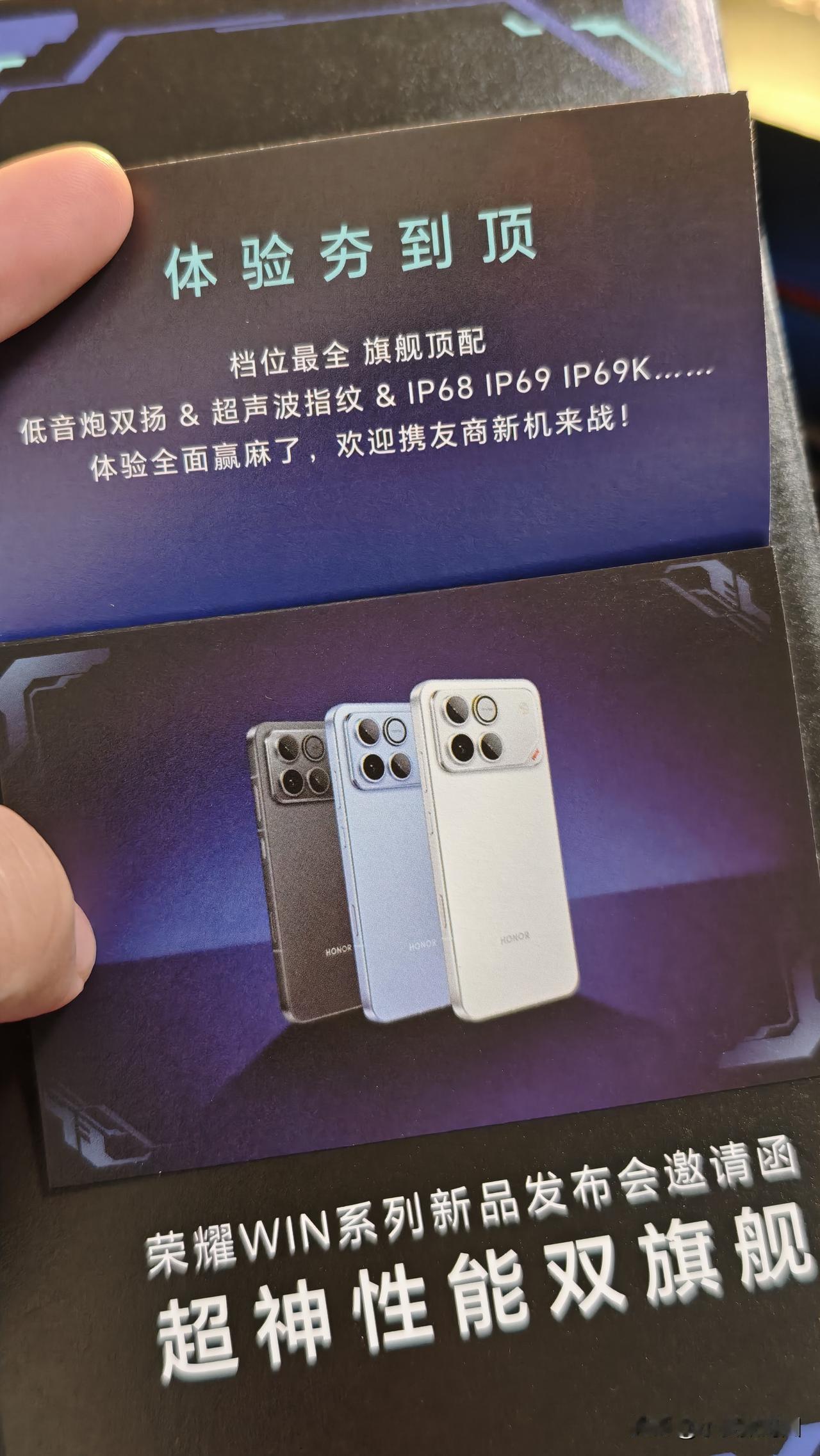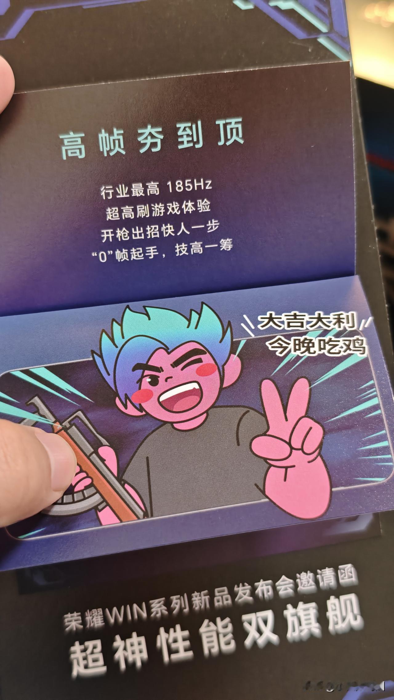 荣耀WIN发布会邀请函是一个抽卡式卡片,一抽一拉满屏都是顶,最后一页赫然写着:超