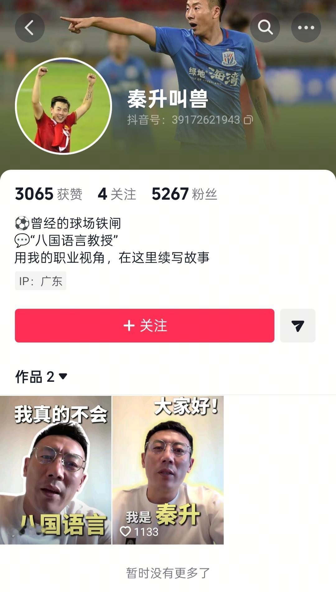 秦“叫兽”?上海申花名宿秦升开通短视频账号,名字叫:“秦升叫兽”。 近日有球迷发现秦升在短视频平台上开了账号,个人简介是:曾经的后防铁闸、八国语言教授。 熟悉秦升的球迷都知道,秦升曾两次在上海申花效力,前后长达6个赛季,因为踢球风格粗野饱受诟病,也因为擅长用各种语言与裁判交流,被球迷戏称会8国语言的“秦叫兽”。 在此前的足坛的打假运动中,据传秦升被查而身陷囹圄,难道现在又出来了? 为了谋生,开个直播,聊聊足球往事,带带货没啥问题,球迷们也理解。毕竟他也需要脱胎换骨,重新做人。秦升 上海申花