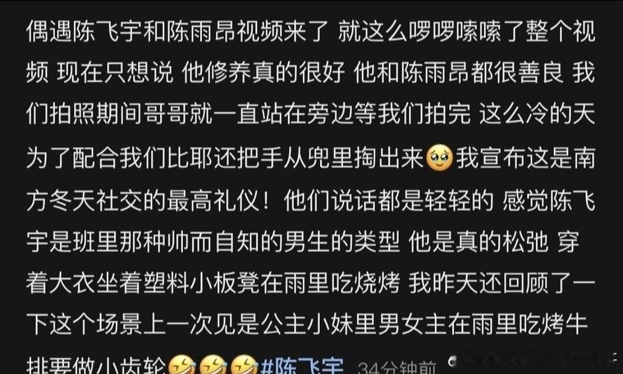 路人偶遇陈飞宇 ,夸他修养真的很好,配合拍照很绅士,在雨里吃烧烤有点可爱