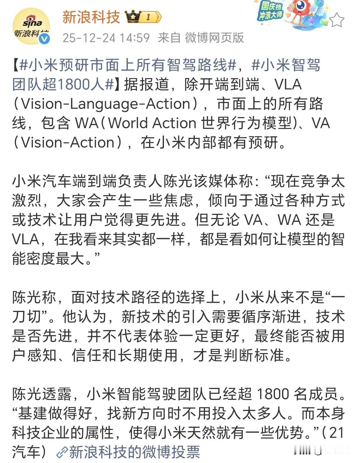 VLA,WA,还是VA?小米全都要! 目前智能驾驶大模型的路线出现分化,VLA的代表有理想和元戎;WA的代表有华为和蔚来;VA的代表是小鹏。 不过在小米看来,这些模型其实是一样的,都是让模型的智能密度最大。 孰优孰劣,有很多因素限制,最终要看用户的认可度。 而这几条技术路线,小米都有预研。 你更看好哪条路线哪?