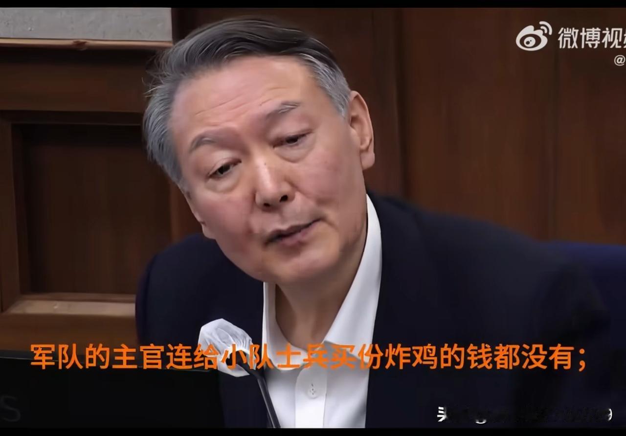 韩国前总统尹锡悦太难了,直到前天在法庭上才说出发布戒严令的真正原因,原来是为了给当兵的搞点买炸鸡的钱。当时的韩国国会在李在明领导下太TM的扣啦,每次尹大总统想提高一点国防预算就被否,尹大总统实在没办法啊,不得不“冲冠一怒为炸鸡”。 (图片来自网络视频截图)